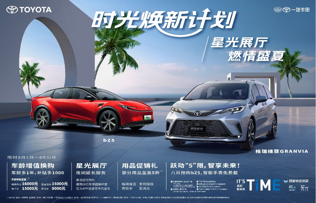 为回馈用户厚爱,上半年,一汽丰田推出了极具诚意的“时光焕新计划”,立足用户购车和用车的全周期,以车龄增加一年补贴增加1000元的“车龄增值补贴”机制,彻底消除用户的里程焦虑。8月份,一汽丰田真诚又加码,车龄增值换购至高补贴16000元;星光展厅夜间延长服务,避开酷暑轻松看车服务更从容;格瑞维亚、普拉多、皇冠陆放、亚洲龙部分用品至高5折;8月抢购全新bZ5还有智能手表免费戴。