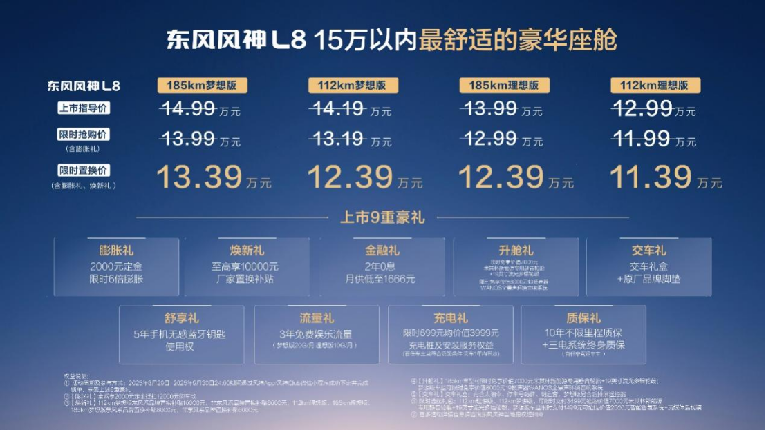8月29日,在第28届成都车展上,东风新旗舰东风风神L8正式宣布上市,限时置换价仅需11.39万元起(可叠加享受国/地补),直接击穿“25万元才能配齐冰箱彩电大沙发”的行业认知,成为这个级别最具竞争力的舒享座舱之王。