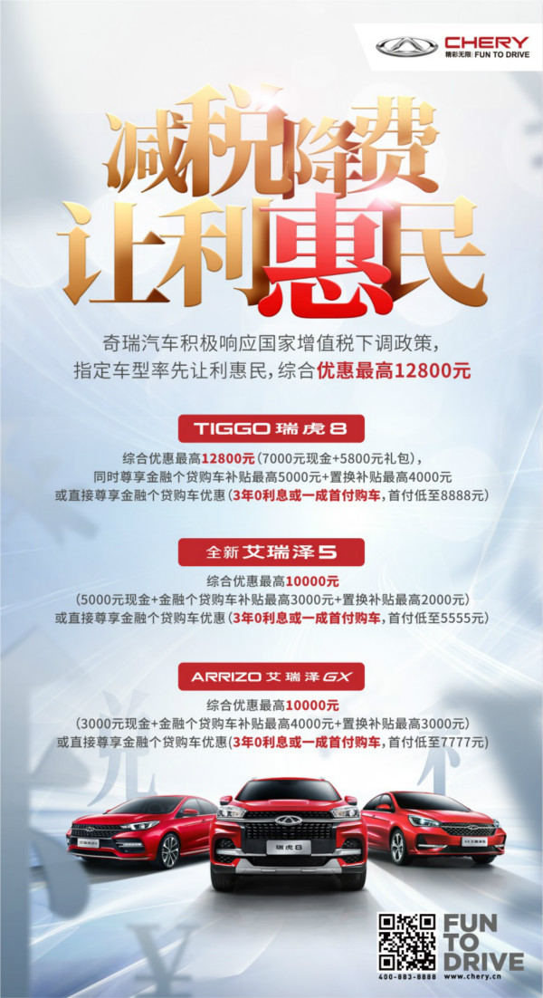 近日,国家相关部门发布关于深化增值税改革有关政策的公告,自4月1日起制造业增值税税率下调政策开始实施。奇瑞汽车积极响应国家政策,率先开启让利惠民购车优惠政策,其中瑞虎系列旗舰车型——瑞虎8综合优惠高达12800元(现金7000现金+5800元礼包)优惠政策,同时还可尊享金融个贷购车补贴最高5000元、置换补贴最高4000元;或直接尊享金融个贷购车优惠(3年0利息或一成首付购车,首付低至8888元)。