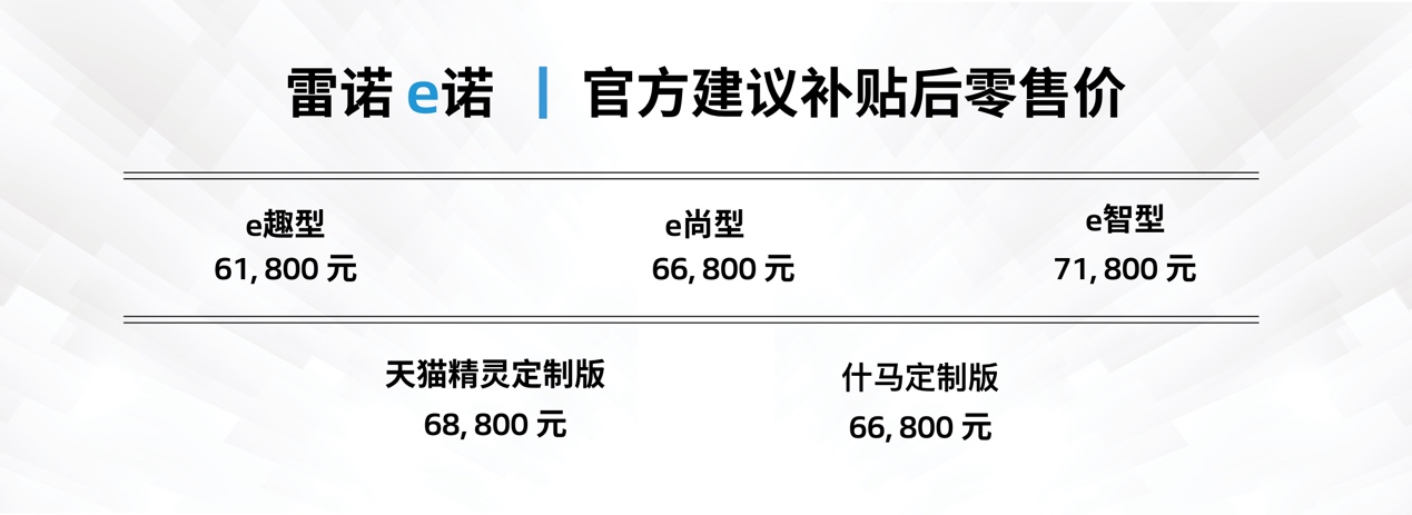 雷诺e诺共推出e趣型、e尚型、e智型和天猫精灵定制版、什马定制版五个版本,补贴后售价从6.18万元到7.18万元,具有极强性价比优势。同时,雷诺 e诺以“雷诺电池保护强盾、充电神器、智能出行”三大产品优势,实现了雷诺电动车的先进性、实用性、成熟性与中国都市电动出行需求的完美结合。