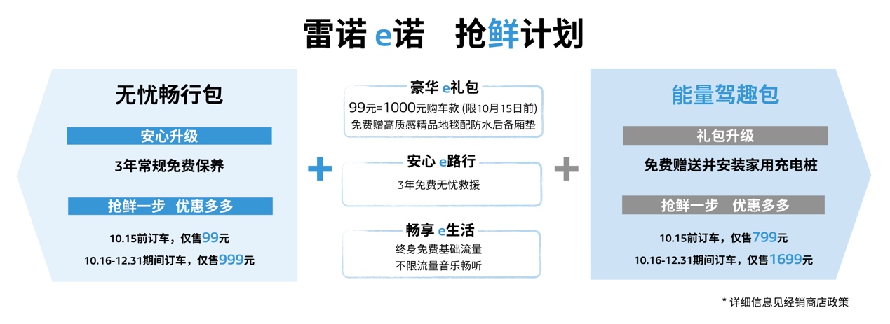 除了诚意十足的价格,雷诺 e诺还为消费者带来了充满惊喜的购车政策,即价值5500元“无忧畅行包”和价值6000元的“能量驾趣包”。