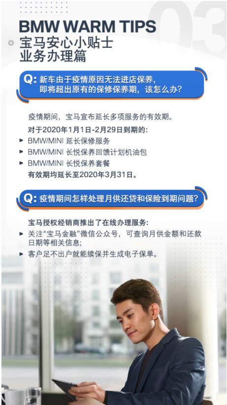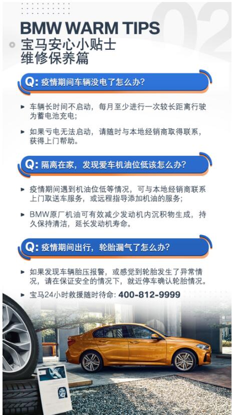 宝马全力聚焦特殊时期的客户需求,以人为本关爱至上,为客户提供高品质服务体验,进一步提升客户满意度。车主的需求,我们呵护,宝马一直都在!