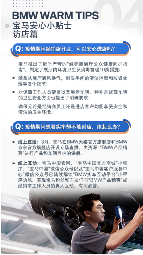 无法出门保养该如何解决?必须开车出门,需要做哪些准备?车内如何消毒赶走病毒君?针对疫情带来的一系列问题,宝马通过“宝马客户服务中心”微信公众号等多种渠道为车主在线答疑解惑,提供爱车与个人防护建议和出行指南,如“特殊时期自驾出行防疫指南”、“开启空调内循环,降低病毒入侵风险”、“爱车消毒,您做对了吗?”等等。
