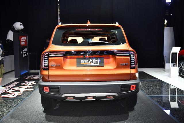 车尾部分,前卫的天际线横贯式尾灯,营造出哈弗大狗的车尾点睛之笔。灯组内置排布规整且点亮效果出彩的LED光源,倒"L"形的新潮设计更是极具辨识度。后杠的设计与前杠遥相呼应,同样辅以带有橙色饰条的银色下护板,硬派粗犷之中也不缺时尚元素。