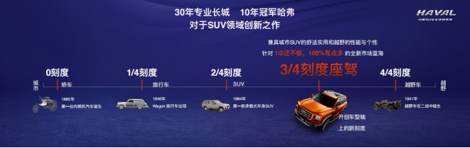 此时此刻,时机已经成熟。行业市场从增量转向存量,消费需求细分趋势加速,再加上哈弗多年的专业沉淀,哈弗快速洞悉到SUV与越野车之间的一个新机会。这是一个兼具城市SUV的舒适实用和越野车的性能与个性,针对1/2还不够、100%却有点多的全新蓝海市场,为此哈弗SUV决定开创车型轴上的新刻度,打造“3/4刻度座驾”哈弗大狗。