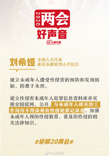 #爱聊20两会#【人大代表刘希娅:#建议有性侵记录者不得从事未成年人工作#】全国人大代表、重庆市谢家湾小学校长刘希娅建议,要建立未成年人遭受性侵害的预防和发现机制,防患于未然。她建议,建立性侵害未成年人犯罪信息资料库并实现全国联网、公开,与未成年人相关的工作岗位不得录用有性侵犯罪记录者,加强未成年人预防性侵教育,普及防性侵的相关法律知识。