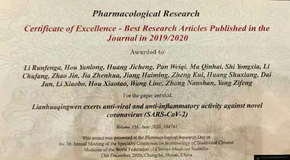 近日,广州呼吸健康研究院、呼吸疾病国家重点实验室杨子峰教授课题组题为《连花清瘟对新型冠状病毒具有抗病毒、抗炎作用》(《Lianhuaqingwen exerts anti-viral and anti-inflammatory activity against novel coronavirus (SARS-CoV-2)》)的研究论文,被国际期刊《药理学研究》(Pharmacological Research)评选为2019/2020年度全球优秀论文奖。 2020年3月17日,《连花清瘟对新型冠状病毒具有抗病毒、抗炎作用》研究论文在《药理学研究》(Pharmacological Research)获得在线刊出,该论文发表至今已被引用百余次,获得国际医学界的认可。这是中成药有效抗新型冠状病毒SARS-Cov-2的基础性研究文章。该论文研究结果显示,连花清瘟能显著抑制新冠病毒(SARS-CoV-2)在细胞中的复制,连花清瘟处理后细胞内病毒颗粒表达显著减少,并且连花清瘟能显著抑制新冠病毒(SARS-CoV-2)感染细胞所致的炎症因子TNF-a、IL-6、MCP-1和IP-10的基因过度表达,该成果证实了连花清瘟通过抑制病毒复制、引起病毒颗粒形体改变及抑制宿主细胞炎症因子表达,从而发挥抗新冠病毒活性的作用,为连花清瘟联合现有治疗手段治疗COVID-2019的应用提供了依据。在此论文研究成果基础上,钟南山院士等做为学术指导,联合武汉大学人民医院、广州医科大学第一附属医院等20余家新冠肺炎收治医院共同开展了“中药连花清瘟治疗新型冠状病毒肺炎前瞻性、随机、对照、多中心临床研究”,结果发表于国际植物医学领域影响因子较高的杂志《植物医学》(Phytomedicine)。研究结果显示,应用连花清瘟胶囊口服14天可显著提高新冠肺炎发热、乏力、咳嗽等临床症状的改善率,明显改善肺部影像学病变,缩短症状的持续时间,提高临床治愈率,遏制新冠病情恶化。基于大量确切的基础实验和临床研究证据,4月12日,国家药品监督管理局批准连花清瘟胶囊/颗粒在原批准适应症的基础上,增加治疗“新型冠状病毒肺炎轻型、普通型”的新适应症。新冠肺炎疫情以来,中医药在抗击疫情中发挥了重要的作用。中西医结合、中西药并用,是中国疫情防控的关键和亮点,也是中医药传承精华、守正创新的生动实践表明中医药抗病毒领域研究具有光明前景,必将激励更多的科技工作者不断深度探索。