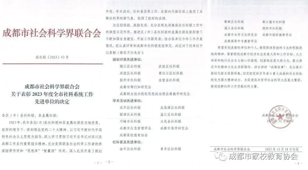 成都市社会科学界联合会今日发布了《关于表彰2023年度全市社科系统工作先进单位的决定》。成都市家校教育协会榜上有名,荣获“2023年度全市社科系统学术活动先进单位”称号。这一荣誉不仅是对协会2023年开展系列公益活动的肯定,也是对协会在学校家庭社会协同育人领域所做出的贡献的高度认可。2023年,成都市家校教育协会深入学习贯彻习近平新时代中国特色社会主义思想,以《家庭教育促进法》为指导,积极开展各类学术交流活动,深入探索学校家庭社会协同育人的新理念、新方法,为构建学校家庭社会协同育人新生态提供了丰富的学术资源和有益的实践指导。协会全面协助电子科技大学工会、基础教育办公室、扶贫办开展了教育帮扶系列活动,先后3次组织成都教育、心理方面的专家和中小学校长前往贵州岑巩、四川康定开展送教帮扶工作。协会还通过出版物、戏剧进校园等丰富多彩的形式,积极探索中华传统优良好家风在青少年中的传播和传承。成都市家校教育协会是由电子科技大会工会等单位发起,成都市社科联主管,成都市民政局审批成立的一级协会。一直致力于整合学校教育、家庭教育、社会(社区)教育专业力量以及专家资源,遵循学校、家庭、社会(社区)教育特点,以人为本,贯彻科学的教育理念,推行适合未成年人身心发展规律和个体差异的教育方法,最终构建学校家庭社会协同育人的新生态。此次荣获成都市社科系统学术活动先进单位称号,不仅是对协会2023年工作的肯定,更是对未来发展的鼓励和鞭策。成都市家校教育协会会长、电子科技大学高等教育研究所副所长杨曦表示,2023年是极不平凡的一年,也是协会扬帆起航之年。一年来,协会全体同仁共同奔赴,克服资源环境、平台初创等困难,开拓进取,积极争取相关部门的支持,主动链接事业合作方,走访大中小学及社区,问需定计。在极短时间内,在省市教育界、慈善公益界声名鹊起,获得越来越多的关注。“在即将送走兔年之际,我们有信心在龙腾四海的来年,务实推进协会各项任务,满足学校家庭社会的深层次刚需,助力成都市教育高质量发展,为实现中国式教育现代化贡献协会智慧。”