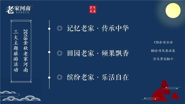 你向往什么样的生活?如果你想找一处甚合心意的好地方放松身心,如果你对田园生活充满期待,不如这个国庆,来咱们河南看看。今年河南省旅游局推出了“记忆老家·传承中华、田园老家·硕果飘香、缤纷老家·乐活自在”三大旅游主题,从九月末至十月末的近一个月中,共推出120余项活动,涉及到景区达85个,带你避开人潮,畅游河南。与此同时,还将陆续推出80余项旅游优惠政策,国庆假期来河南旅游,可以享受门票免票、打折等活动。家文化:记忆老家 传承中华新乡宝泉于9月21日率先开展了“2018河南中秋雅乐赏听会”。活动以壮美的南太行山水为背景,以先秦以来的河南古乐器及古乐谱复原演奏贯穿全场,以“千人朗诵中秋诗词”为亮点,以河南特色文化服饰展演为内容充实,为消费者奉献了一场传播“老家河南”诗与远方结合的形象品牌推广盛会。随着宝泉文化活动的开启,河南各省辖市旅游景区的各项文化活动正式拉开序幕。10月1日至10月7日期间,焦作温县陈家沟将开展“太极大师亲授之旅”活动。同一时期,你可以到安阳殷墟景区看殷商情景剧演出;到巩义杜甫故里赴一场穿越唐朝的诗会;到河南许昌看“神垕古镇钧瓷开窑节”的开窑仪式;到三门峡看地坑院民俗展演;到商丘看火神台景区“商”文化展演;到永城芒砀山旅游区观大汉华服秀、千人品汉宴、中华成童礼;还有济源五龙口景区的西游狂欢节,商丘火神台景区的“商”文化展演,周口太昊陵景区明太祖朱元璋祭祖仪式......各项文化体验活动极具地方特色,让你尽享河南文化盛宴的体验之旅。 十月的中原大地,满眼丰收的景象,在这里,邀你来咱们河南“老家”看看,带你回归田园,摘红果,赏秋色,满足你对美好生活的全部期待。“丰收伏牛山·陪你一起看秋色”活动9月21日已经在栾川庄子村正式启动,游客们可以进行“丰收民俗展演、特色农产品展销、秋果采摘”等系列农事体验。国庆即来,大家还可以到栾川老君山参加五彩秋趣节,赏红叶,采秋果;到红旗渠体验农民丰收节暨稻田艺术节活动,传递红旗渠精神;到新安龙潭大峡谷,在世界地质公园里赏圆月;到三门峡豫西大峡谷参加首届“峡谷赏秋节”,看民俗古村,品豫西美食;到南阳丹江大观苑赏秋水,品秋鱼等。喜欢摘果子的你可以到灵宝寺河山采摘大枣和苹果,到新郑享中华枣乡风情游,到荥阳过河阴石榴文化节,到驻马店看确山县板栗节,到商丘宁陵县体验酥梨采摘节。你可以和三五好友相约,或者带着家人孩子,来这里感受到田园老家的乡村秋趣。民宿发展也渐成气候,在新县大别山、焦作云台山、林州太行大峡谷、巩义石居部落等都有别具一格的民宿小院,或有青砖铺道、或有古树参天,斑驳的古井,映着盈盈的岁月。来到这里,细细体味慢节奏的田园生活。家生活:缤纷老家 乐活自在每年的秋天,嵩山层林浸染,红叶妆点着悬崖绝壁;伏牛山系的秋天,万山红遍,色彩斑斓;太行山系的秋天,红叶绚烂,展现独特的山景资源。在这里聚集了数万登山、骑行、攀岩、摄影等户外活动的爱好者,共同见证河南的“山色秋韵”。随着繁花盛开,红叶茫茫,一系列的摄影、赏花、游园活动当然少不了。镜头可以留住这里的美:平顶山首届“秀丽二郎山·最美灯台架”摄影大赛、鹤壁大伾山“古韵古风醉十月”摄影家采风活动、新乡万仙山金秋摄影节、商丘归德府文庙中国古建筑摄影展等,摄影爱好者们可千万不要错过。赏花就要到八朝古都开封去了,久负盛名的开封菊花文化节给你品不尽的菊香宋韵。还有驻马店嵖岈山温泉小镇的首届七彩百合文化节,“花都”鄢陵第十八届中原花木博览会,给你千亩花海的五彩繁盛。 缤纷的文化盛宴让你酣畅淋漓,真实的劳动体验给你充实与满足感,赏花、驻足、漫游给你全身心的放松体验,尽享秋季好时节的浪漫与美妙。放慢生活的节奏,回归田园,远离纷杂烦扰,专注一朵花的绽放,静待一颗果的成熟。在这里,给你想要的向往生活。为了切实给大家带来福利,在双节期间,河南旅游业界推出了近百项旅游惠民政策以及免票、打折等优惠措施。根据省发改委相关文件,自9月20日起,少林寺、龙门石窟、云台山、小浪底景区门票降价幅度约为20%;另有许昌大鸿寨,驻马店南海禅寺、老乐山等景区也出台了降价措施。河南这么美,国庆长假你不来看看吗?