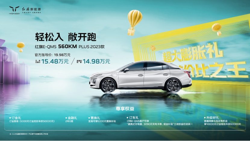 6月26日,红旗E-QM5 560KM PLUS 2023款正式上市。该款车型定位“航价比之王”,是基于对用户需求的深刻洞察将续航、能耗、价格三者进行完美平衡后的“幸福”杰作。上市发布会全程以直播方式举行,为助力广大用户真正实现“轻松入,敞开跑”,红旗新能源直播间推出了多项惊喜购车礼遇,以极富诚意的超级福利与全国网友一同燃爆狂欢盛宴。除了此前透露的五千抵五万超大膨胀礼,用户还可获得1万抵6万的直播间专属福利,这一举措让网友直呼“给力”。当天直播观看人次破79万,累计点赞1190万次,展现出了红旗新能源强大的品牌号召力与产品影响力。超值膨胀礼,互动玩法多样红旗E-QM5 560KM PLUS 2023款官方指导价19.98万元,重磅福利加持下,到手价仅需14.98万元。除了直播间超值膨胀礼1万抵6万,更有2年0息金融政策,5千元置换政策和便携式充电器、2500元现金补贴、3090元充电卡券三选一等惊喜礼遇,这套“组合拳”的重磅出击,掀起了全民狂欢热潮。省心的出行装备,畅爽的福利,炫酷的互动玩法,让整场直播充满年轻活力的气息。网友只需听从主播口令,在指定时间内发送相应弹幕并截图,私信后台,留下联系方式,即可以享受直播间专属优惠价。互动弹幕频刷,直播间氛围高潮迭起。场景化直播,产品力创新演绎发布会当天,三位特殊的“体验官”空降直播间,针对E-QM5 560KM PLUS的续航、舒适性、空间等方面进行了生动而真实的体验分享。三位嘉宾在线划重点,与围观群众敞开畅聊,思想激荡,脑洞大开,让粉丝们在轻松愉悦的氛围中感受品牌魅力,增进对产品在续航、空间、舒适度等各方面的了解。空间体验官“EVA的科技生活”作为首位体验嘉宾亲身示范,展现出比肩D级百万豪华轿车的头等舱的尊贵享受。据介绍,E-QM5 560KM PLUS车身长达5040mm,车宽1910mm,轴距达2990mm,前后座椅中心距达1.1米,赋予同行者伸展自由,对家庭用户和有宠物的车友十分友好。此外,前排中央储物箱、车门储物箱等车内储物空间也十分贴心,带来了独特的舒适感与便利性。后备箱容积达433L,可轻松容纳两个28寸行李箱或三个20寸行李箱,接机送客装载远途行囊,轻松自如。舒适体验官“杰克涛”随后现身直播间,在沉浸式舒躺中呈现出置身在家中的驾乘感受。车内空气洁净,清新风智能净化空调自带PM2.5过滤以及花粉过滤。城市出行如同穿行在“森林氧吧”,清新空气畅快呼吸。空调温度可分区调节,可满足不同乘坐者的需求。直播现场,杰克涛以小实验的方式展示了车舱静谧性,车窗关闭前后隔音效果显著。据悉,该款车型搭载超细纤维材料、声学玻璃、5层隔音结构等7项NVH专利技术,实现60公里/小时城市工况,车内噪声53分贝,达到了“中国生态汽车评价”C-ECAP白金牌水平,可有效降低旅途中的噪音。续航体验官“詹志斌同学”针对560版E-QM5的续航力进行了评析。此前,詹志斌完成了对该款“航价比之王”的续航挑战,此次来到直播间,他述说了自己的亲身体验,该款车型给人澎湃的动力体验,动能表现强悍,伴随有强烈的推背感。在高效能宽适应的电驱系统加持下,完美平衡了马力与节能,支持标准、经济两种驾驶模式以及三种能量回收模式,可自由组合6种驾驶模式,能够满足不同场景下的省电需求,帮助用户坦然面对各种复杂路况。据詹志斌介绍,全新E-QM5搭载超大容量电池,CLTC续驶里程560公里,通过轻量化、低风阻、低滚组、高效能量回收等技术,百公里电耗仅13.2kWh。在对E-QM5 560KM PLUS的续航挑战测试中,詹志斌同学与伙伴们打卡电视剧《狂飙》拍摄地江门,百公里仅用15度电。此外,E-QM5 560KM PLUS充电10分钟,可行驶100公里,电量从30%充至80%只需要30分钟,迅速便捷,长途无忧。电车的安全方面一直是消费者关心的重点,红旗E-QM5 560KM PLUS 2023款坚如遁甲,扭转刚度达42800Nm/°。FCW前方碰撞预警及AEB自动紧急刹车系统等智能安全技术全程守护,主被动安全、电池安全及制动安全三位一体,国车标准三重保障安全设计,让绿色出行更安心。三位达人的专业评析,让大家如临其境般地感受到了该款车型的魅力。一番趣味解读后,体验官们纷纷变身宠粉官,为网友们送上了一波又一波的专属福利,整场围观体验充满趣味性,令人情绪高涨。红旗新能源通过全新沟通方式与年轻群体积极互动,凭借更符合时代潮流、更高“航价比”的产品满足了消费者对于续航、性能、品质与价格的综合需求,以更大力度的政策优惠为大众提供更经济、更实惠的出行选择。接下来的几天,E-QM5 560KM PLUS的直播狂欢周还将继续,网友表示这波“壕礼”必须拿稳。6月27号到30号,每晚18:00锁定红旗新能源直播间,抓住限定购车福利!与红旗新能源共享E-QM5 560KM PLUS 2023款上市盛典。