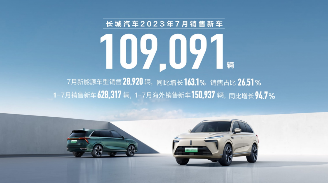 8月4日,长城汽车股份有限公司(股票代码:601633.SH,02333.HK;以下简称“长城汽车”)发布2023年7月产销数据。今年7月,长城汽车销售新车109,091辆,同比增长7.03%;新能源车型销售28,920辆,销售占比达26.51%,均创新高;海外销售27,007辆,同比增长83.60%,再创历史新高。7月,在智能新能源技术赋能下,长城汽车新能源势能不断释放,全球化布局日渐深入,推动终端市场表现持续上扬,连续7个月保持稳定增长,整体发展态势明显向好。长城智能新能源势头高涨 带动终端市场表现火热 伴随长城智能新能源矩阵的持续焕新,今年7月,长城汽车各品牌均实现了新能源销售的快速攀升,在燃油车市场基本盘稳固的基础上,推动终端市场持续保持高热度与稳增长。哈弗品牌7月销售62,967辆,其中哈弗新能源销售10,105辆,连续两个月破万。哈弗新能源龙序列全新成员——哈弗B26正式命名哈弗猛龙,将以“1.5T+Hi4+后桥差速锁”打造新能源越野SUV普及者,让越野不再小众;新哈弗H5强势回归,首批量产车已下线,将以全新领域开拓者的姿态,引领SUV市场步入全用途时代;2024款哈弗大狗上市,安全守护与智慧科技同步进化,为用户带来硬派潮野新体验。魏牌新能源7月品牌整体销售6,652辆。魏牌蓝山持续热销,7月销售5,566辆,连续三月保持环比增长,上市至今累计销量达到17,258辆,成为30万元级家庭大六座SUV的新首选。蓝山绿色健康座舱顺利通过检测更严格、标准更高的中汽研“儿童优先(绿色座舱)”认证。车内优质空气、婴童级材料安全、电磁辐射安全三项检测结果全优,这次认证不仅是对蓝山健康座舱环境的认可,更彰显了魏牌新能源以用户为中心的责任与担当。高山仰止,乘势而上,魏牌高山内饰首次曝光,以新能源高端MPV专属平台打造全家人的出行头等舱。高山作为魏牌新能源MPV品类的最新成果,将于下半年正式推出。欧拉品牌7月销售10,116辆,同比增长14.58%。欧拉闪电猫以健康安全指数测评总分第一的成绩,荣获中国汽车健康指数五星认证,并在车辆电磁辐射(EMR)、车内颗粒物(PM)两项测试中取得100分成绩,成为唯一获得两项考核满分的车型。欧拉好猫在2023懂车帝夏测中的极限高温满载续航达成率、极限高温车内甲醛测试,以及整车安全可靠性等项目中表现同样出色,再一次印证欧拉品牌毋容置疑的高品质。坦克品牌7月销售13,490辆,同比增长8.15%,其中坦克500 Hi4-T销售2,023辆,总订单量累计已超8,000辆。坦克500 Hi4-T依托越野超级混动架构Hi4-T,全面满足多样化用车需求,带来强动力、多场景、极度可靠的标杆级用车体验,开创越野新纪年。长城皮卡7月销售15,841辆,1-7月累计销售118,437辆,同比增长6.97%。长城炮7月销售11,432辆,累计35个月销量过万,蝉联皮卡销量冠军。基于西南高原山区用户需求及用车场景打造的专属车型——长城炮定制版上市,新车型分为商用炮定制版和乘用炮定制版,以“不惧山高”“不惧道险”“不惧路滑”的硬核实力,打造高原征服者的驾乘新体验。2023款越野炮&火炮试驾会燃擎开启,两款车凭借强悍越野实力,赢得专业媒体一致赞誉。全球化发展再提速 海外销售连续5个月破2万辆今年7月,伴随多款智能新能源产品海外上市,以及“生态出海”模式的加速落地,长城汽车全球化发展再提速,海外销售创历史新高,达到2.7万辆,已连续5个月实现海外销售突破2万辆大关。新产品持续出海,不断夯实海外市场基础。欧拉好猫在巴西上市,进一步深化GWM品牌在巴西市场的影响力,带动巴西汽车市场电动化转型。坦克500在巴林上市,此前该车已在中东市场各国开展接力上市,当地媒体、用户好评不断。坦克500在哈萨克斯坦上市,助力长城汽车持续开拓欧亚区域市场。“生态出海”模式在中亚持续落地。长城汽车与乌兹别克斯坦汽车集团ADM汽车工厂就乌兹别克斯坦市场开发合作正式签署战略合作协议。长城汽车将以高质量的汽车产品为乌兹别克斯坦市场带来新的市场活力和发展机遇,将通过燃油及新能源产品,与合作方全面开展本地化合作,实现哈弗品牌及地产车型2023年成功上市销售。“生态出海”模式受到产学研各领域专家认可。在7月举办的“中国-拉美汽车产业发展论坛”上,长城汽车与社会各界共同探讨在拉美区域发展的机遇和挑战,分享了征战拉美汽车市场的阶段性成果和“生态出海”新模式,为中国汽车品牌出海拉美探航,受到多方关注与肯定。踔厉奋发,笃行不倦。随着长城智能新能源势能的持续释放,长城汽车正进入新能源的快速发展期,更多重磅新能源产品也将陆续登场及出海,全力推动企业发展向上向好。