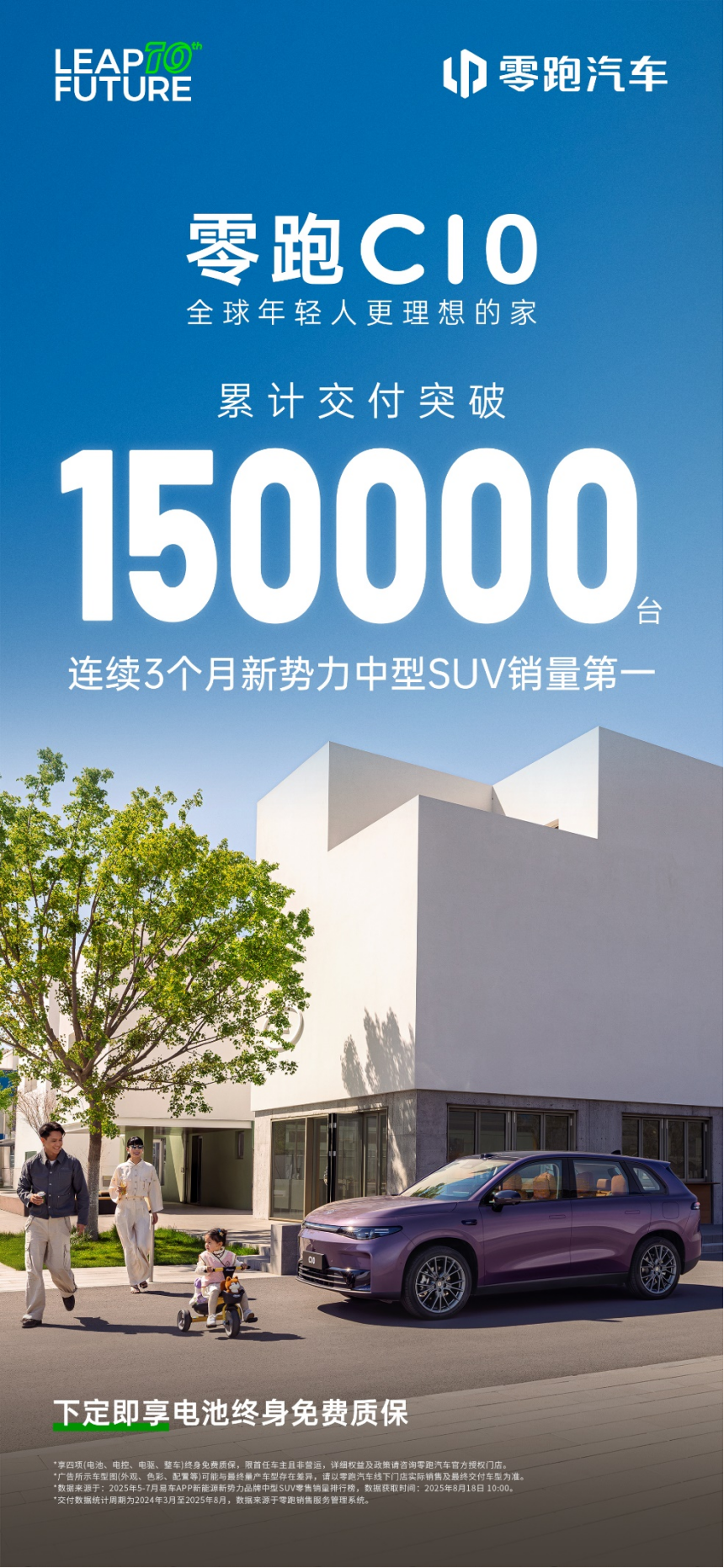 2025年8月18日,零跑汽车迎来里程碑时刻——旗下全球战略车型零跑C10上市仅16个月,累计交付量突破15万台,刷新品牌在售车型最快达成此规模的纪录!这款以“全球年轻人更理想的家”为定位的中型SUV,不仅在2025年5-7月连续3个月蝉联新势力中型SUV销冠、稳居上半年销量榜首,更以纯电动中型SUV一年保值率第二的成绩(中国汽车流通协会&精真估数据),成为年轻家庭“既要品质又要价值”的标杆之选。15万台背后:四大进阶实力,精准戳中家庭痛点零跑C10的热销,源于对用户需求的精准洞察。2026款车型基于零跑LEAP3.5技术架构焕新,用“全维度越级”解决家庭用车核心焦虑:续航补能双无忧:纯电版605km超长续航,搭配全域800V高压快充,16分钟即可补能307km,长途出行不用“等充电”;驾控舒适不妥协:中欧顶级底盘团队联合调校,兼顾城市通勤的平顺与山路驾驶的激情,5米级车身也能开出灵活感;智能安全双在线:高通骁龙8295P旗舰座舱带来丝滑交互,激光雷达加持的端到端辅助驾驶覆盖高速、城区常见场景;更拿下中欧澳三大五星安全认证,车身高强度钢占比达80%以上,给家庭满满安全感;空间实用够灵活:2825mm轴距打造“全场景座舱”,二排座椅可调节角度,后备厢常规容积达510L,露营装备、儿童推车轻松收纳,满足多人口家庭出行需求。全球化征程提速:从中国到欧洲,1500家门店覆盖全球作为零跑“生而全球”的战略车型,C10的足迹早已遍布世界:2023年慕尼黑车展首秀崭露头角,2024年3月国内上市交付、9月登陆欧洲13国,年底进军东南亚;2025年1月增程版入欧、3月英国上市即热销,同月达成10万台交付;6月登陆中国香港,同步完成全球第1500家零跑中心落成,国际化布局再提速。值得关注的是,第15万台C10车主为头部知识博主卢克文,这也印证了C10在年轻高知群体中的认可度——他们既看重“800V快充、激光雷达”等硬核配置,也青睐“保值率高、空间灵活”的实用属性,而零跑C10恰好实现了“科技与实用”的完美平衡。从16个月15万台的交付速度,到全球市场的持续开花,零跑C10不仅成为品牌“冲量”的核心支柱,更彰显了中国智造的全球竞争力。依托Stellantis集团的合资加持与自研技术沉淀(自研自造占比65%,拥有CTC电池底盘一体化等领先技术),零跑汽车正以C10为起点,加速驶向世界级智能电动车企的目标,未来更值得期待。