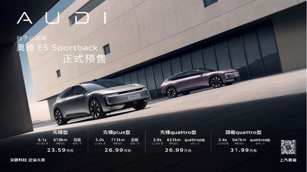 2025年8月18日,上汽奥迪正式宣布旗下首款量产豪华电动车型——奥迪E5Sportback开启预售,全系推出先锋型、先锋plus型、先锋quattro型、旗舰quattro型4款配置,限时预售价23.59万元起。作为奥迪全新电动车设计语言在华的首发之作,这款车型以“突破科技启迪未来”为核心,融合德系豪华驾控基因与中国智能科技,从设计、性能、智能、权益四大维度,为先锋用户打造高端电动出行新选择。设计:科幻美学+高效风阻,6款车色显个性奥迪E5Sportback高度还原概念车设计,封闭式格栅、集成灯光模组、电子外后视镜与贯穿式扰流板的组合,不仅营造出极具未来感的科幻造型,更将风阻系数降至最优,兼顾美学与效能。内饰以“结构化建筑美学”为基调,进口原木饰板搭配30色隐藏式渐变氛围灯,打造环抱式豪华座舱;车身提供月曜黑、晨曦紫、流光银等6款先锋车色,其中4款专属色(晨曦紫、流光银、锋芒绿、烟波蓝)限时免费,满足用户个性表达。性能:3.4秒破百+773km续航,quattro四驱加持性能层面,奥迪E5Sportback延续品牌运动基因:搭载前后永磁同步电机,最高转速21,000rpm,峰值扭矩800Nm,旗舰quattro型零百加速仅3.4秒,媲美性能跑车;集成宁德时代CTP无模组电池,CLTC最高续航达773km,配合800V高压平台,10分钟即可补能370km,彻底告别续航与补能焦虑。驾控上,双电机quattro智能四驱系统经赛车级验证调校,搭配CDC可变阻尼减震、空气悬挂与Brembo四活塞卡钳,再加上后轮转向系统,让5米级车身兼具操控精准度与乘坐舒适性,无论是城市通勤还是长途远行,都能带来稳定从容的驾驶体验。智能:8295芯片+激光雷达辅助驾驶,交互更自然智能配置堪称“豪华级”:座舱搭载高通骁龙8295旗舰芯片与全新AUDIOS操作系统,流畅度与响应速度行业领先;奥迪助手基于火山引擎“豆包”大模型,支持多轮对话、语义理解与全场景车控,语音交互突破传统局限;奥迪智慧岛延续MMI设计理念,实现“自然交互,触手可及”。辅助驾驶方面,车辆集成27个感知硬件(含激光雷达、3个长距毫米波雷达、11个摄像头),依托英伟达Orin-X芯片算力与Momenta飞轮大模型方案,可覆盖城市道路、高速高架、泊车等全场景,为用户提供安全可靠的智能驾驶支持。限时权益:5重豪礼加持,购车零压力即日起支付1999元预订金,用户可享至高价值6.9万元的“5重预售礼”:全景驾享礼:价值3.6万元,限时终身免费使用奥迪全景辅助驾驶;座舱升级礼:价值1.5万元,先锋plus型/先锋quattro型免费升级前排座椅按摩、后排加热、Bose音响等9项奢适配置;数智焕新礼:价值1.2万元,全系免费升级超清电子外后视镜,提升恶劣天气视野;出圈出色礼:价值6000元,4款专属车色限时免费;金融无忧礼:0首付起,5年超长贷,前24期免息,降低购车门槛。品质保障:中德合璧智造,量产即交付奥迪E5Sportback诞生于上汽奥迪AUDI智造基地,这座工厂融合德国精工与中国智造,年产量达36万台,以高度自动化、机器学习质量监控与全数字化管理确保品质。目前新车已开启预售,即将正式上市交付,消费者可前往全国上汽奥迪门店体验。上汽奥迪全新CEO宋斐明表示:“奥迪E5Sportback是品牌深化中国电动化布局的里程碑,它以纯正奥迪基因融合中国顶尖技术,诠释‘美美与共’的合作精髓。”这款23.59万起售的豪华电动车型,不仅填补了奥迪在中端电动市场的空白,更将以“无短板”的产品力,引领豪华智能出行新范式。