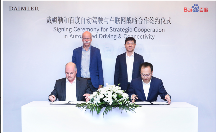 随着中德两国在自动网联驾驶领域合作步伐的加速,近日,戴姆勒与百度签署谅解备忘录,深化双方在自动驾驶和车联网等领域的战略合作。双方达成一致,将通过拓展这些领域的项目,建立更加紧密的合作关系,包括继续深化在百度Apollo平台的合作,以及共同探索智能互联服务的新领域。戴姆勒于2017年7月加入百度Apollo平台,是该自动驾驶开放平台的首批成员之一。同年底,戴姆勒成为Apollo理事会单位,致力于同百度及其他平台成员一道,持续推进适用于中国、高安全性的自动驾驶技术的研发。戴姆勒股份公司董事会主席、梅赛德斯-奔驰汽车集团全球总裁蔡澈博士(Dr. Dieter Zetsche)表示:“当今汽车行业正发生巨变,戴姆勒持续推进‘瞰思未来(C·A·S·E)’战略,在中国和全球不断创新。尤其在中国,自动驾驶和智能互联正以前所未有的速度迅猛发展,戴姆勒未来的成功也建立在引领该领域产业方向和技术潮流的基础之上。戴姆勒和百度已经建立了紧密的伙伴关系,此次签约成为双方深化战略合作的又一里程碑。”百度创始人、董事长兼首席执行官李彦宏先生表示:“在人工智能、大数据时代,汽车产业将以完全不同的逻辑进化,由垂直整合向平台化、生态化演进。这也是全球范围的汽车制造公司、科技公司等开放合作,聚合起‘智能生态共同体’的最好机会。期待百度与戴姆勒的深化合作,将为汽车产业全球化的‘跨界牵手’做出表率,推动全球自动驾驶产业更进一步发展。”戴姆勒股份公司董事会成员、负责大中华区业务的唐仕凯先生(Hubertus Troska)表示:“在中国研发自动驾驶和智能互联领域的技术,需要深入了解中国市场的特点。戴姆勒与百度的强强联合,将中德在智能网联汽车领域的合作推向新高度。百度Apollo平台的技术为戴姆勒在北京的自动驾驶道路实测提供了强大支持,双方将共同努力,继续研发适配中国市场的解决方案。我们致力于同本土伙伴们携手合作,为中国客户提供最符合其需求的产品和服务。”百度总裁张亚勤博士表示:“自动驾驶、智能网联等技术与汽车的结合正在给百年汽车产业带来产品形态与人车交互方式的深度变革。戴姆勒是汽车制造领域的领军企业,百度在自动驾驶领域布局深厚,此次双方进一步深化适用中国市场的自动驾驶和智能网联产品的落地,将为中德汽车合作树立智能研发合作的标杆,同时也将为中国消费者带来驾乘体验的全方位跃升。”今年7月初,戴姆勒成为首家获得北京市自动驾驶车辆道路测试牌照的国际汽车制造商,标志着其在华进行本土研发的又一里程碑。戴姆勒自动驾驶测试车基于梅赛德斯-奔驰V级豪华多功能车打造,拥有出众的装载能力和灵活的车内布局。这些梅赛德斯-奔驰测试车辆配备了百度Apollo平台相关技术,在北京市海淀区的测试场内进行了大量测试。根据最新签署的谅解备忘录,双方将秉承把所有道路使用者的安全放在首位的理念,在自动驾驶研发领域紧密协作并发挥各自优势,继续在已开放测试的公开道路上和专用测试场地中添加新的测试环境,提高场景复杂度。同时,双方拟启动一项新的车联网领域合作项目,在梅赛德斯-奔驰MBUX智能人机交互系统中引入更多百度提供的互联服务。随着数字化的飞速发展,戴姆勒不断拓展与本土合作伙伴们、特别是与中国科技巨头在研发领域的合作。戴姆勒积极拓展与百度的合作,旨在为中国客户提供更多“汲中国灵感,为中国创新”的梅赛德斯-奔驰品牌产品和服务。双方的合作始于2013年,最初的项目包括共同开发兴趣点(POI)和目的地检索的相关功能。2014年,梅赛德斯-奔驰成为第一家将“百度全景地图”引入其产品的豪华汽车制造商,并于2016年将手机车机智能互联解决方案“百度CarLife”引入在中国市场销售的梅赛德斯-奔驰车型。