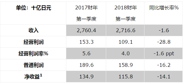日产汽车公司公布了2018财年第一季度(2018年4月1日至2018年6月30日)的财务报告。在2018财年第一季度,日产汽车公司实现经营利润1,091亿日元,净收入27,200亿日元,经营利润率为4.0%。受原材料价格上涨和汇率波动的影响,日产汽车公司第一季度净收益1为1,158亿日元,下降14.1%2018财年第一季度主要数据以下图表总结了2018财年第一季度(2018年4月1日至2018年6月30日)的财报数据,其中日产汽车公司在华合资公司的绩效数据均采用权益法计算。日产汽车公司2018财年第一季度主要财务信息(基于东京证券交易所报表-中国合资公司部分基于权益法计算)2单位:十亿日元2017财年第一季度2018财年第一季度同比增长率%收入2,760.42,716.6-1.6经营利润153.3109.1-28.8经营利润率%5.64.0-1.6ppt普通利润189.6158.9-16.2净收益1134.9115.8-14.1根据管理层预估报表(含日产汽车公司在中国合资公司的经营业绩),日产汽车公司2018财年第一季度的经营利润达1,544亿日元,经营利润率为5.1%,净收益1达1,158亿日元。销售业绩2018财年第一季度(4-6月),日产汽车公司的全球总销量达131万台,下降3.0%。其中日本市场销量13万台,下降0.8%,市场份额为10.9%。与去年同期相比,日本汽车行业总销量达119万台,下降1.0%。日产汽车公司在中国市场的销量数据按自然年统计,销量增长6.9%,达33.6万台,市场份额较去年同期相比增长0.3%至5.0%。日产Kicks劲客、奇骏、天籁、轩逸和Navara(纳瓦拉)以及启辰D60为该市场畅销车型。日产汽车公司在美国市场的销量达36.5万台,市场份额为8.1%。在欧洲(包含俄罗斯),日产汽车公司的销量达16.2万台,下降12.7%,市场份额为3.1%。日产汽车公司在俄罗斯市场的销量达23万台,下降0.6%,市场份额为5.0%在亚洲和大洋洲、拉丁美洲、中东和非洲等市场,日产汽车的销量达20万台,增长6.6%。2018财年全年展望日产汽车公司预测2018财年的股息将上涨7.5%至每股57日元。1归属于母公司持有人的净收入。2从2013财年开始,日产汽车和东风汽车公司合资成立的东风汽车有限公司,采用权益法会计核算方法。尽管在新的会计方法之下,净利润报告不会发生改变,但此后的损益表中不再包含东风汽车公司的收入和经营利润。