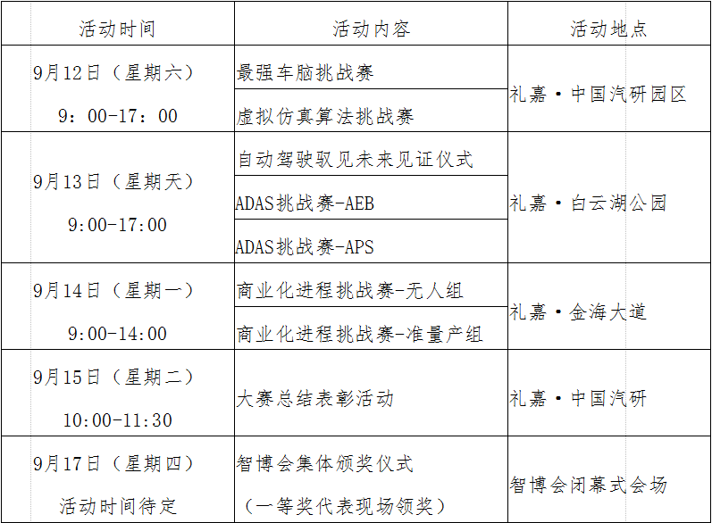 比赛项目:涵盖L1-L5全级别自动驾驶能力测评;不仅测评单车智能,还对V2V/V2I的能力进行测评;既有车内设安全员的自动驾驶比赛,也有车内不设安全员的完全无人驾驶,以及5G远程驾驶比赛。