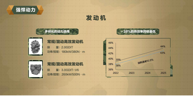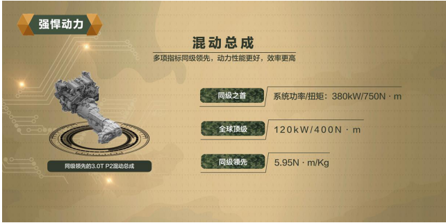 在动力方面,坦克平台涵盖ICE、PHEV、HEV三种动力形式,常规高效发动机实现了38%的同级最优发动机热效率。匹配中国首款纵置9AT变速器,扭矩密度和齿比跨度同级领先,实现了重量更轻、动力性能更好、效率更高。坦克平台的3.0GDIT+ 9AT P2的动力组合也堪称全球最强越野动力,其系统总功率为380kW,峰值扭矩可达750N·m,为坦克平台的极致越野提供了强劲的动力保障。