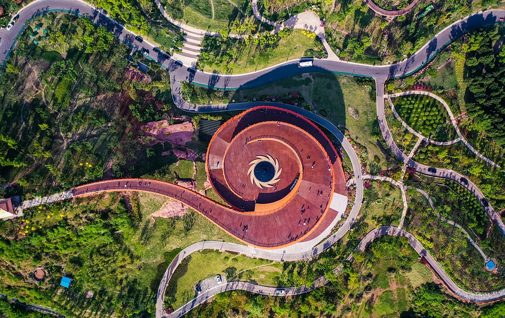 站在丹景台往下看去,这一大片森林公园被春日打造成了五彩缤纷的彩林,其间人工的雕琢与天然的景观融洽地结合在一起,毫不违和,令人赏心悦目。