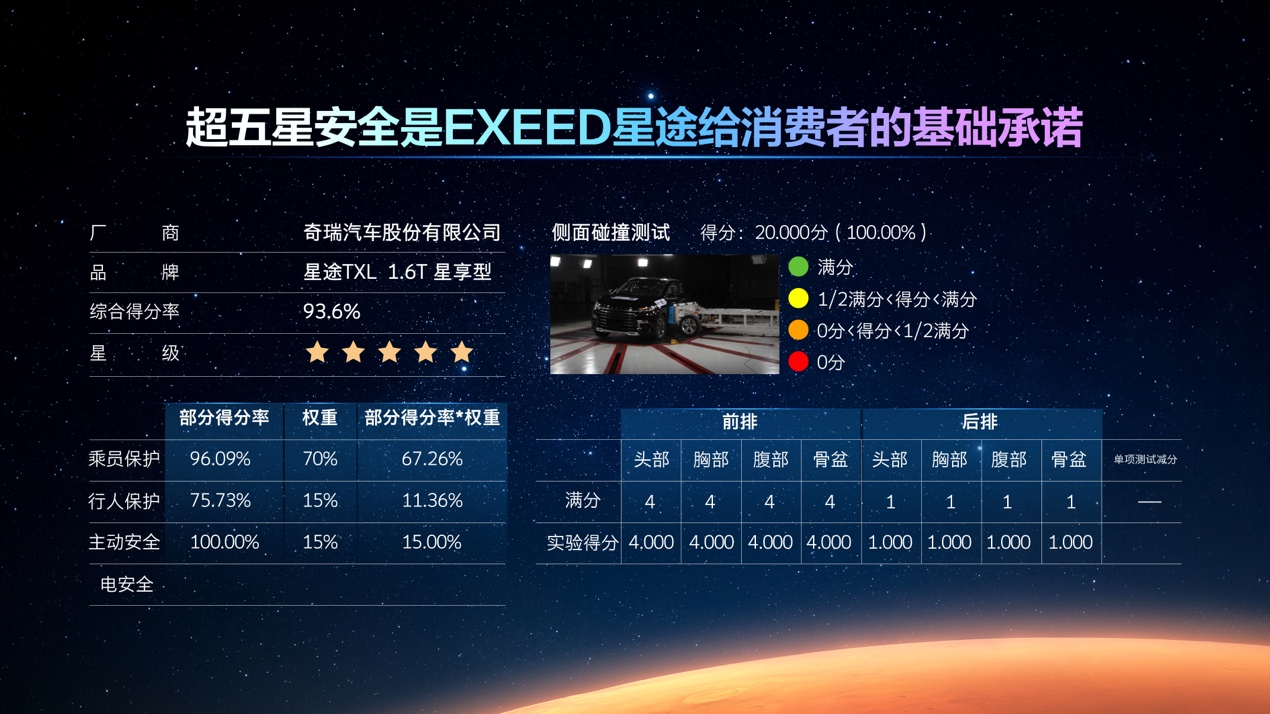无论是此前星途全新一代TXL以93.6分的成绩荣膺C- NCAP五星+安全评级,还是星途揽月以近乎满分的成绩成功完成C- NCAP双车相对速度128公里/小时车对车碰撞,超五星安全始终是烙印在星途品牌骨子里的品质基因。