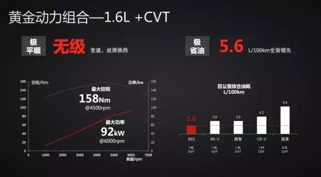 值得一提的是荣威RX3是国内首款配备1.6L+CVT无级变速箱的紧凑型互联网SUV。荣威RX3 1.6L CVT无级变速箱车型,百公里油耗低至5.6L!且动力输出非常线性,如丝般顺滑。在紧凑级SUV中,荣威RX3的燃油经济性独一无二。