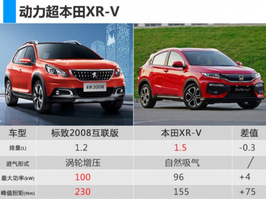 东风标致2008互联版提供1.6L、1.2T两种动力,最大功率分别为86kW、100kW,峰值扭矩分别为150Nm、230Nm,传动系统匹配6速手自一体变速箱,其中1.2T车型每百公里综合油耗为5.4L/100km。与竞争对手本田XR-V1.5L车型相比,2008互联版1.2T车型在动力上占据优势。
