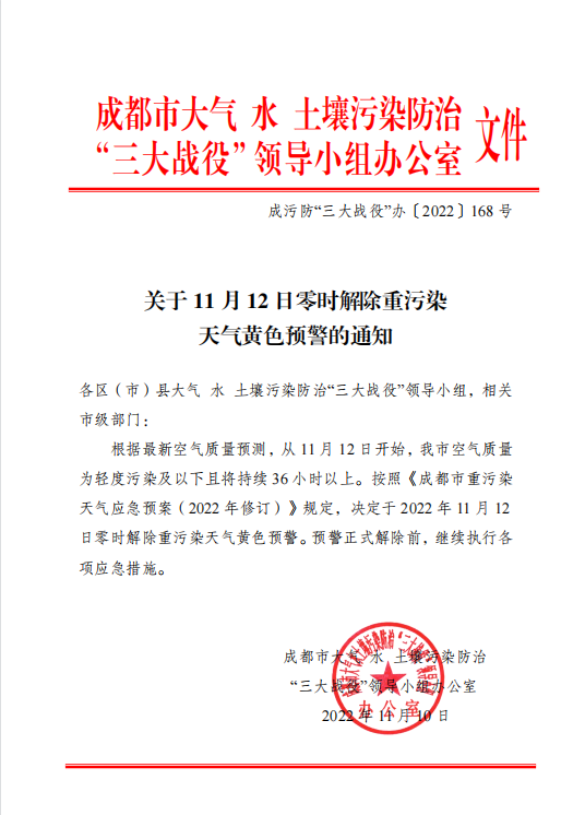 根据最新空气质量预测,从11月12日开始,我市空气质量为轻度污染及以下且将持续36小时以上。按照《成都市重污染天气应急预案(2022年修订)》规定,决定于2022年11月12日零时解除重污染天气黄色预警。预警正式解除前,继续执行各项应急措施。