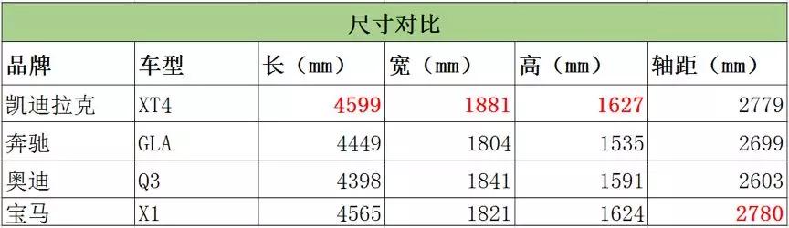 横向来看,XT4的车身尺寸为4599mm*1881mm*1627mm,轴距2779mm,相比于奥迪Q3、奔驰GLA等对手都大了一圈,当然,轴距上比宝马X1少了1mm,但外面大出来的一圈已经足够吸引中国消费者了。此外,动力方面,Q3、X1、GLA的2.0T车型在最大马力上均低于XT4全系标配的2.0T发动机,最关键的是,如果要选购BBA的2.0T发动机,价格可就高了一大截。