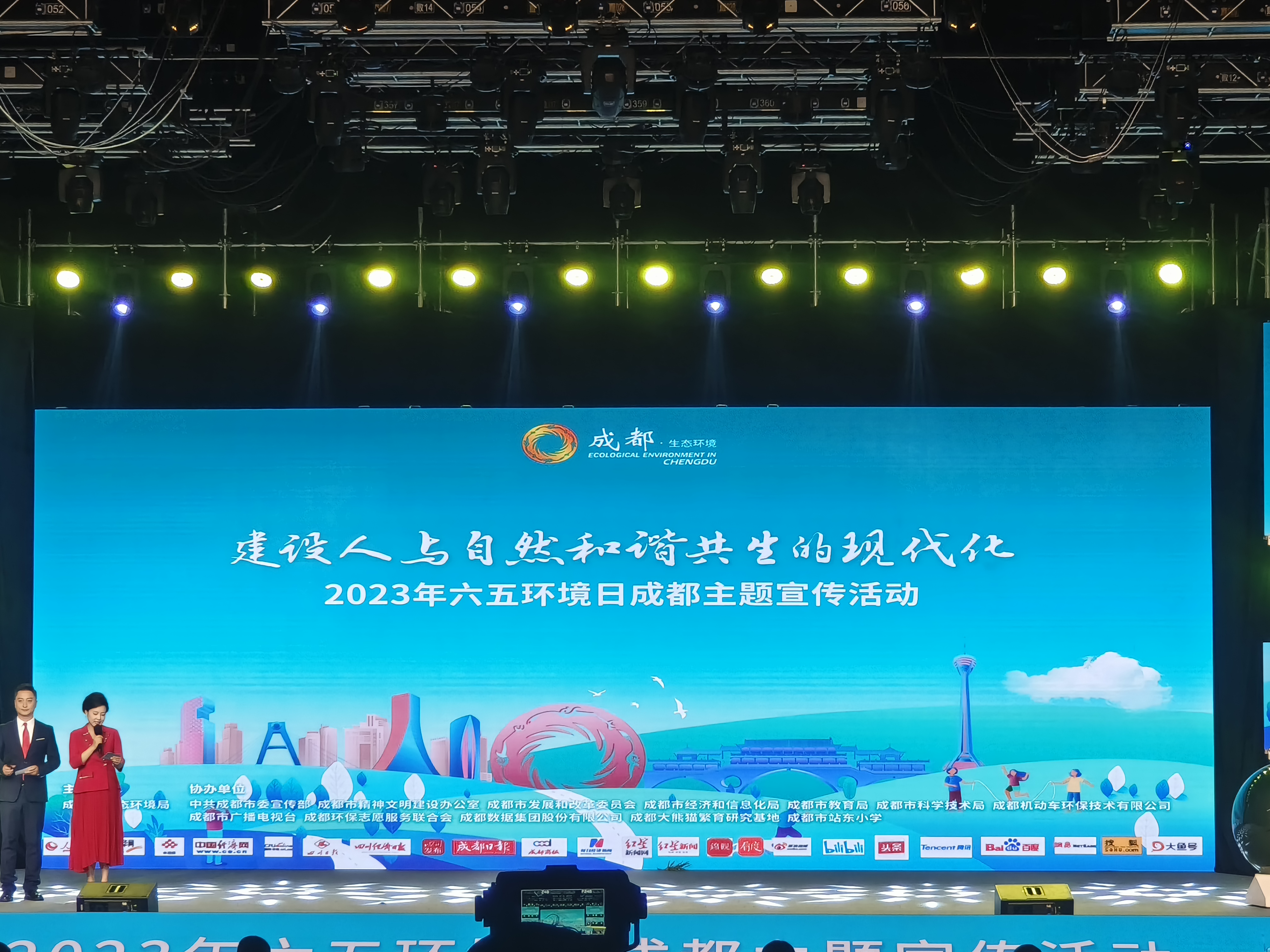 2023年05月31 20:35 来源:蜀锦传媒5月的成都生机盎然,触目皆绿。31日下午,在水墨画境中,鹅黄青绿里,当《千里江山图》的音乐响彻整个成都广播电视台演播大厅时,由成都市生态环境局主办的,以“建设人与自然和谐共生的现代化”为主题的2023年六五环境日成都主题宣传活动正式拉开帷幕。