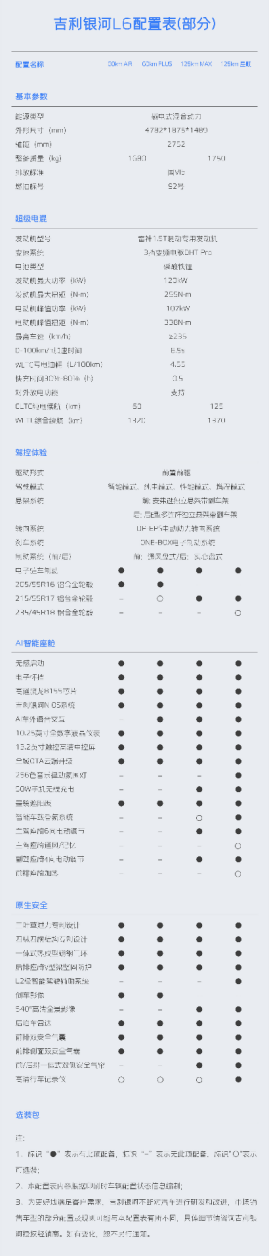 8月18日,新一代全能电混家轿—吉利银河L6公布部分版型详细配置信息。从此次曝光的配置表来看,吉利银河L6推出60km和125km两种纯电续航,AIR、PLUS、MAX及星舰共4个版型。整车价值感、品质感、科技感、体验感全线拉满,不管是新一代雷神电混8848、神盾电池安全系统、银河N OS智能车载系统等高端先进技术,还是吉利全栈自研的全场景AI智能大模型、13.2+10.25英寸双大屏、全域OTA、感应解锁无感启动等前沿先锋科技,均全系标配,全方位给到用户满满诚意。