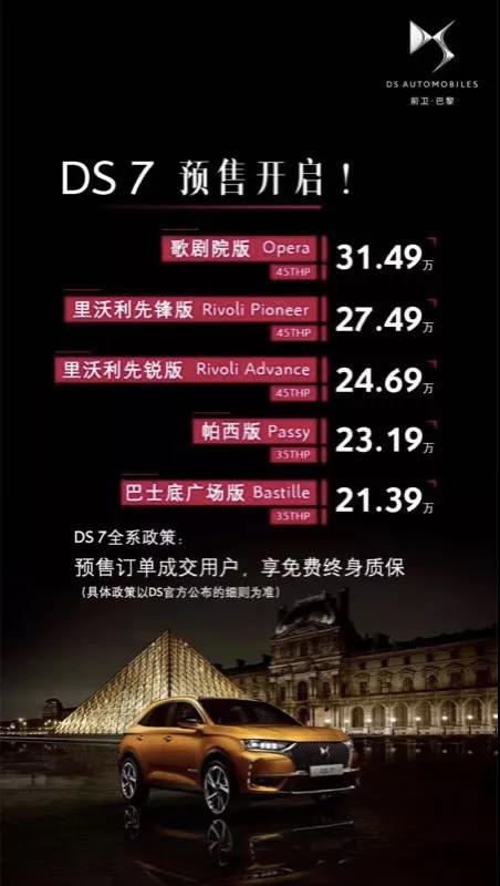 但这里我们所说的同级别是因为其宣扬的豪华车定位。在豪华车领域,DS品牌还是新手,要走的路还很多,抛开“豪华”一词,DS不得不去跟中端合资品牌争夺市场,相比而言,价格就成了其劣势。幸而,DS官方宣称在4月25日北京国际车展正式上市前预订DS7且成交的客户将享受终生质保的待遇,这是一种市场行为,也是一种品牌态度。未来,DS7将接受来自猛烈的市场考验,品牌影响力必须要与产品力齐头并进。