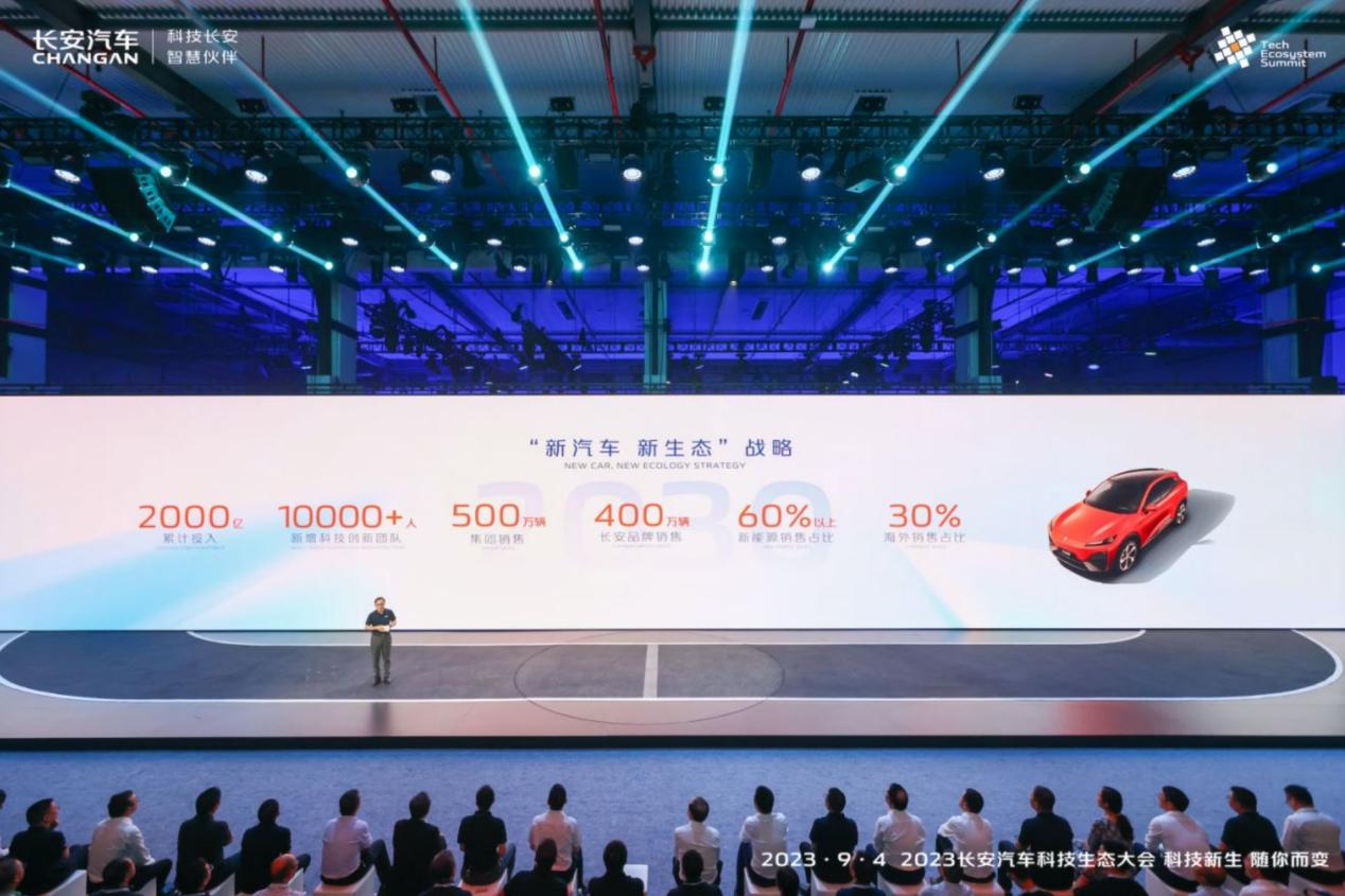 2023年09月07 15:03 来源:蜀锦传媒在2023科技生态大会上,长安汽车分享了数智跃迁的落地成果和探索进程,并展示了即将量产的新汽车和SDA平台架构量产技术成果。朱华荣表示,长安汽车将坚定推进“新汽车 新生态”战略,到2030年累计投入2000亿元,新增1万余人的科技创新团队,实现集团销售500万辆,其中长安品牌400万辆,新能源销售占比60%以上,海外销售占比30%,成为“数智新汽车”时代的引领者!