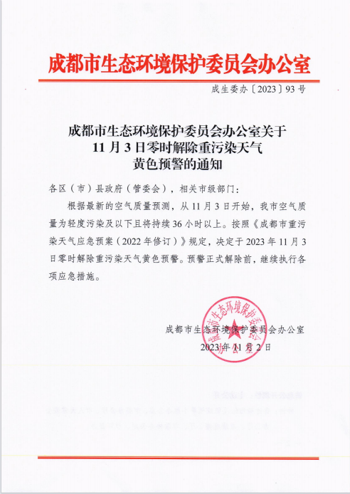 根据最新的空气质量预测,从11月3日开始,成都市空气质量为轻度污染及以下且将持续36小时以上。按照《成都市重污染天气应急预案(2022年修订)》规定,决定于2023年11月3日零时解除重污染天气黄色预警。预警正式解除前,继续执行各项应急措施。