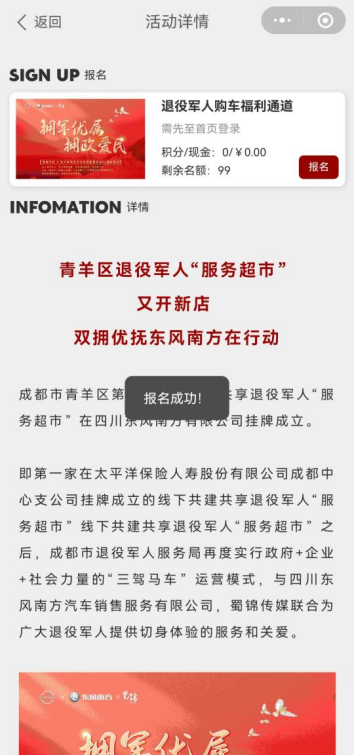 本次四川东风南方联合蜀锦传媒在四川退伍军人服务局的带领下共同为延安双拥运动80周年助力,为退役军人在四川东风南方线下门店提供专属购车福利,13款车型,至高补贴85000元,把福利落到实处!