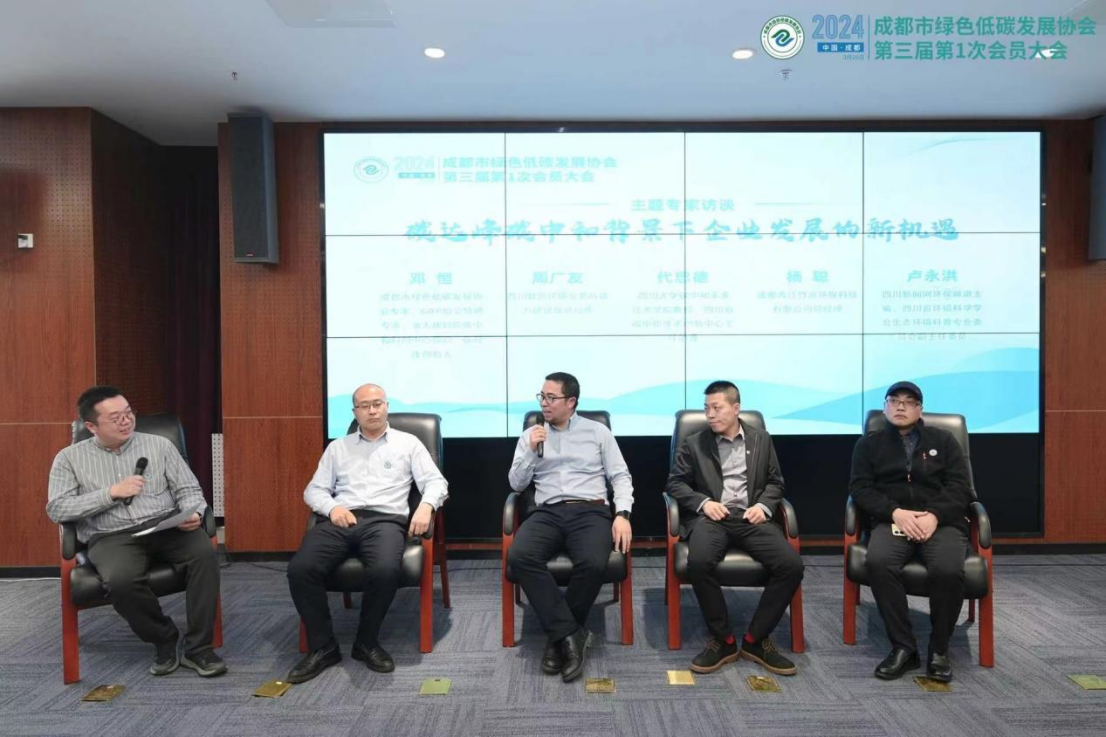 会议特别邀请了成都市绿色低碳发展协会专家邓恒作为专家访谈环节主持人,与四川联合环境交易所有限公司能力建设部总经理周广友,四川大学碳中和未来技术学院教授、四川省碳中和创新技术中心主任助理代忠德,成都青江竹浪环保科技有限公司总经理杨聪,四川新闻网环保频道主编、四川省环境科学学会生态环境科普专业委员会副主任委员卢永洪,围绕“碳达峰碳中和背景下企业发展的新机遇”的主题,共话绿色低碳新趋势、共议企业发展新方向。
