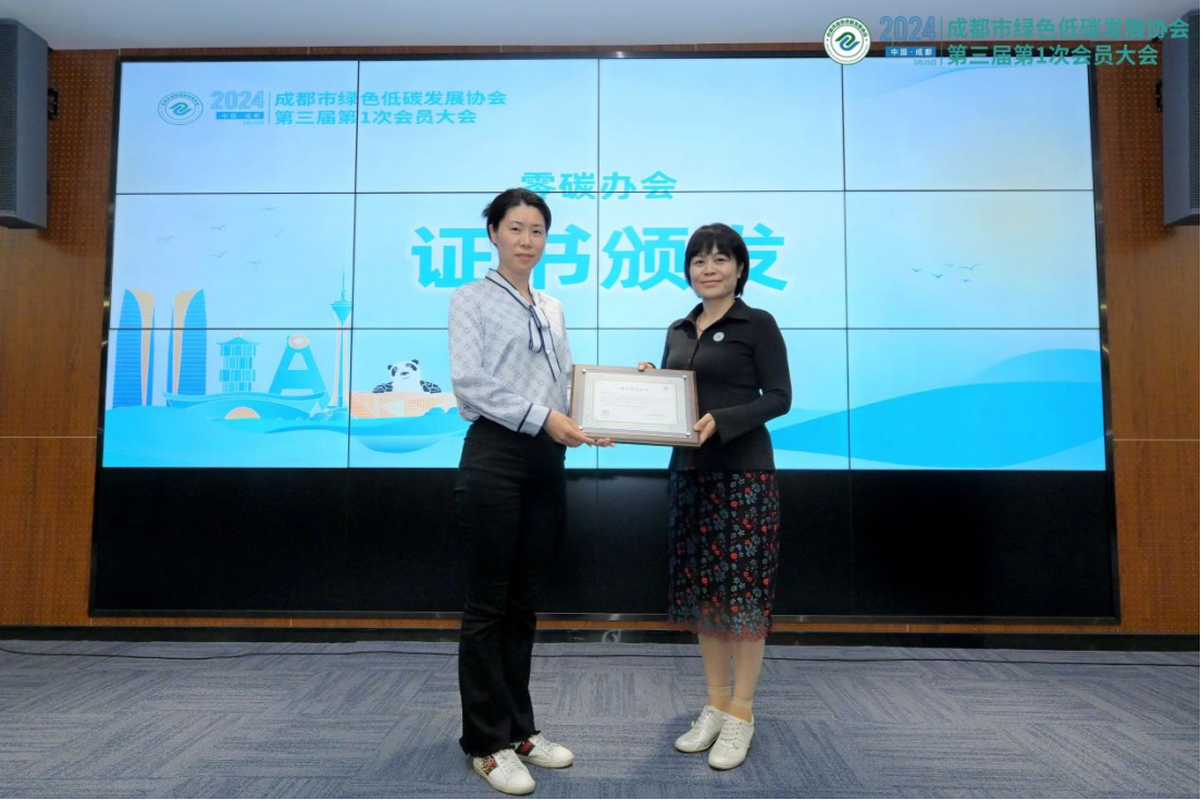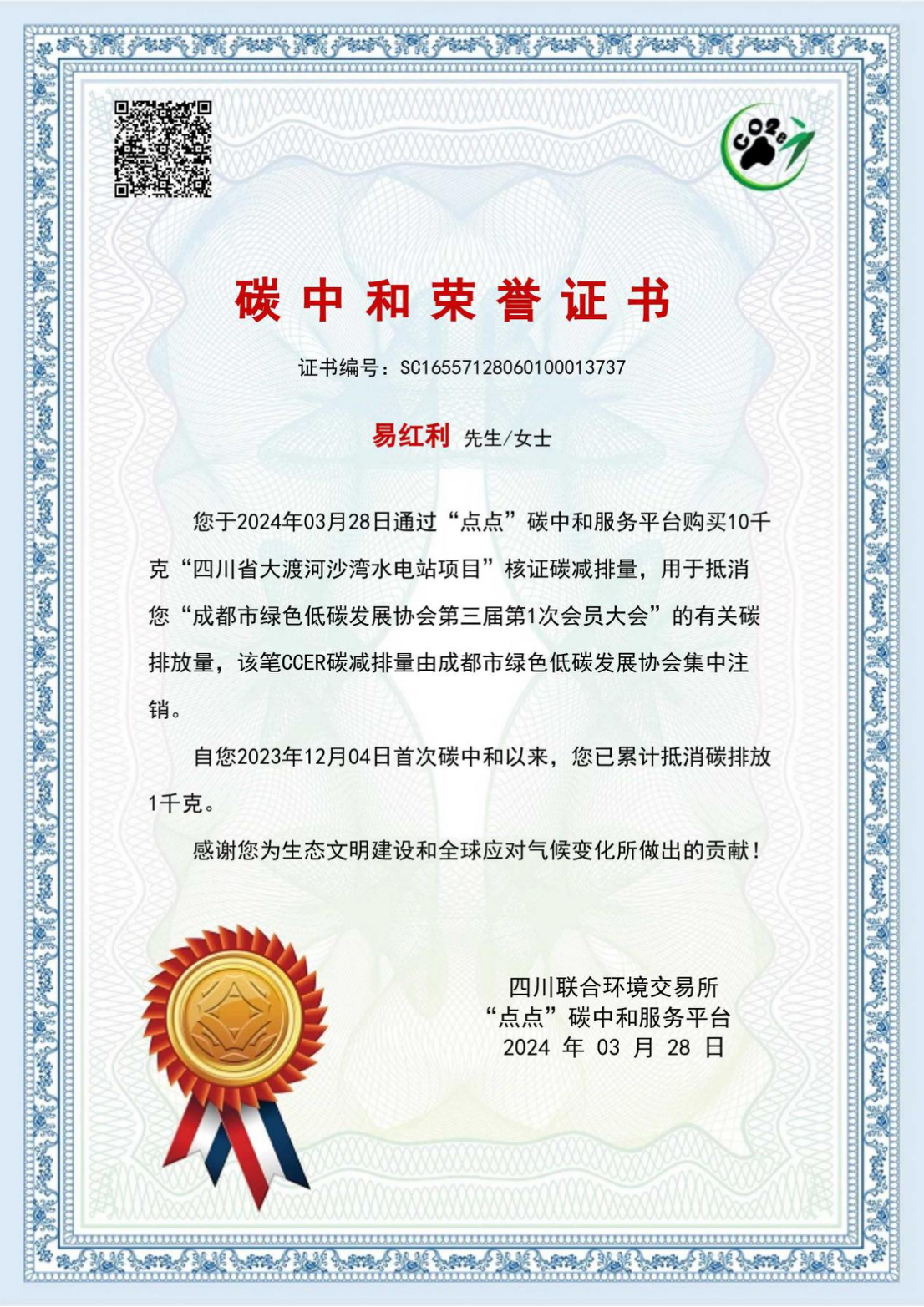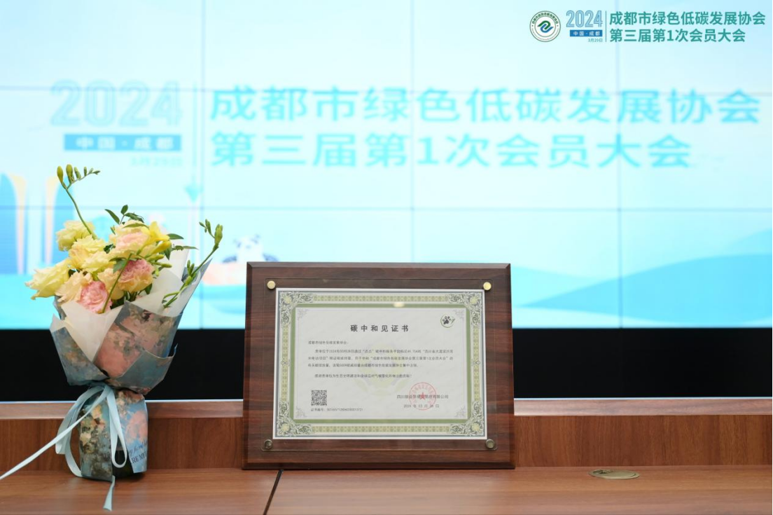 本次会议筹办以租赁代替购买,使用替代性纸张,美陈材料也使用了可回收、可降级的瓦楞纸,将其进行榫卯结构组合,形成了环保理念的展板,经过具备资质的第三方核查机构认证,在全过程碳排查后,通过点点碳中和服务平台集中注销核证碳减排量,用于本次大会全过程碳排放量。四川联合环境交易所有关部门负责人为本次大会颁发了碳中和见证书。值得一提的是,四川联合环境交易所“点点”碳中和服务平台推出“我赠碳,您中和”的赠碳功能,支持本次活动为参会人员发放了专属碳中和荣誉证书,助力其抵消自身碳排放,实现碳中和。