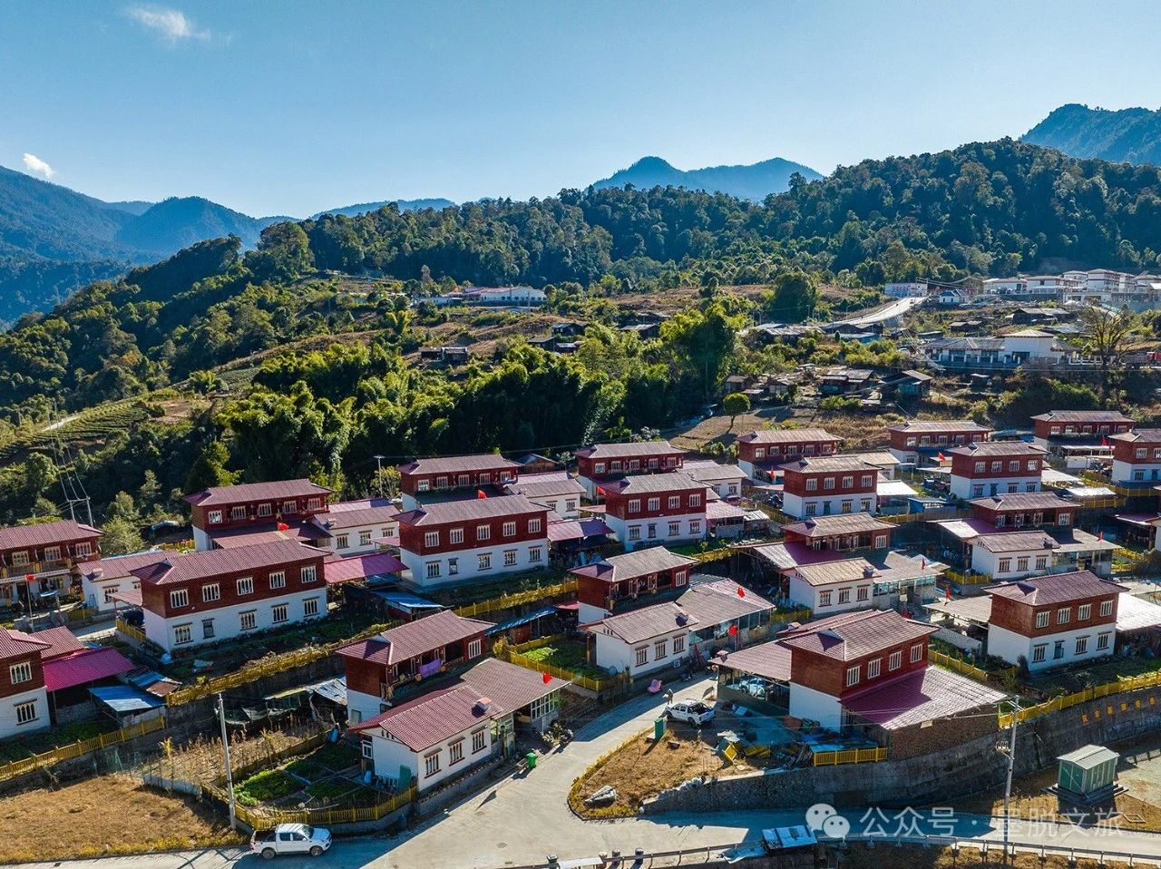 第一次来到德尔贡村,你一定会被莽莽森林中的这个绝美村落惊艳:统一的红色屋顶、洁白的墙体、干净整洁的院落、房前屋后的菜园、通往每户家庭的水泥路等等。
