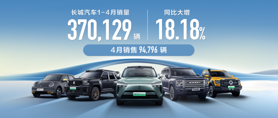 4月,长城汽车销售新车94,796辆。其中,海外销售36,141辆,同比增长65.68%,创历史新高;新能源销售22,436辆,同比增长50.94%;20万元以上车型销售25,625辆,同比大涨98.18%。1-4月,长城汽车累计销售新车370,129辆,同比大增18.18%。长城汽车继续保持硬派越野车型销量第一,越野新能源车型销量第一,皮卡车型销量第一。
