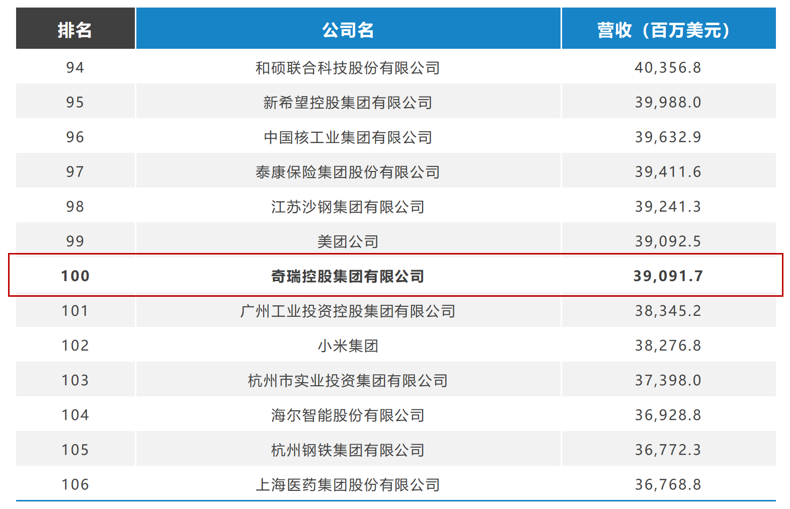 2024年07月26 22:25 来源:蜀锦传媒7月25日,财富中文网发布了2024年《财富》中国500强排行榜。奇瑞控股集团有限公司以390.917亿美元营业收入登榜,位列排行榜第100位,比2023年大幅上升68位次,营业收入增加167.902亿美元。那么问题来了,对于即将在8月初公布的《财富》世界500强榜单,奇瑞能够首次入榜吗?如果能入,排名会是多少?
