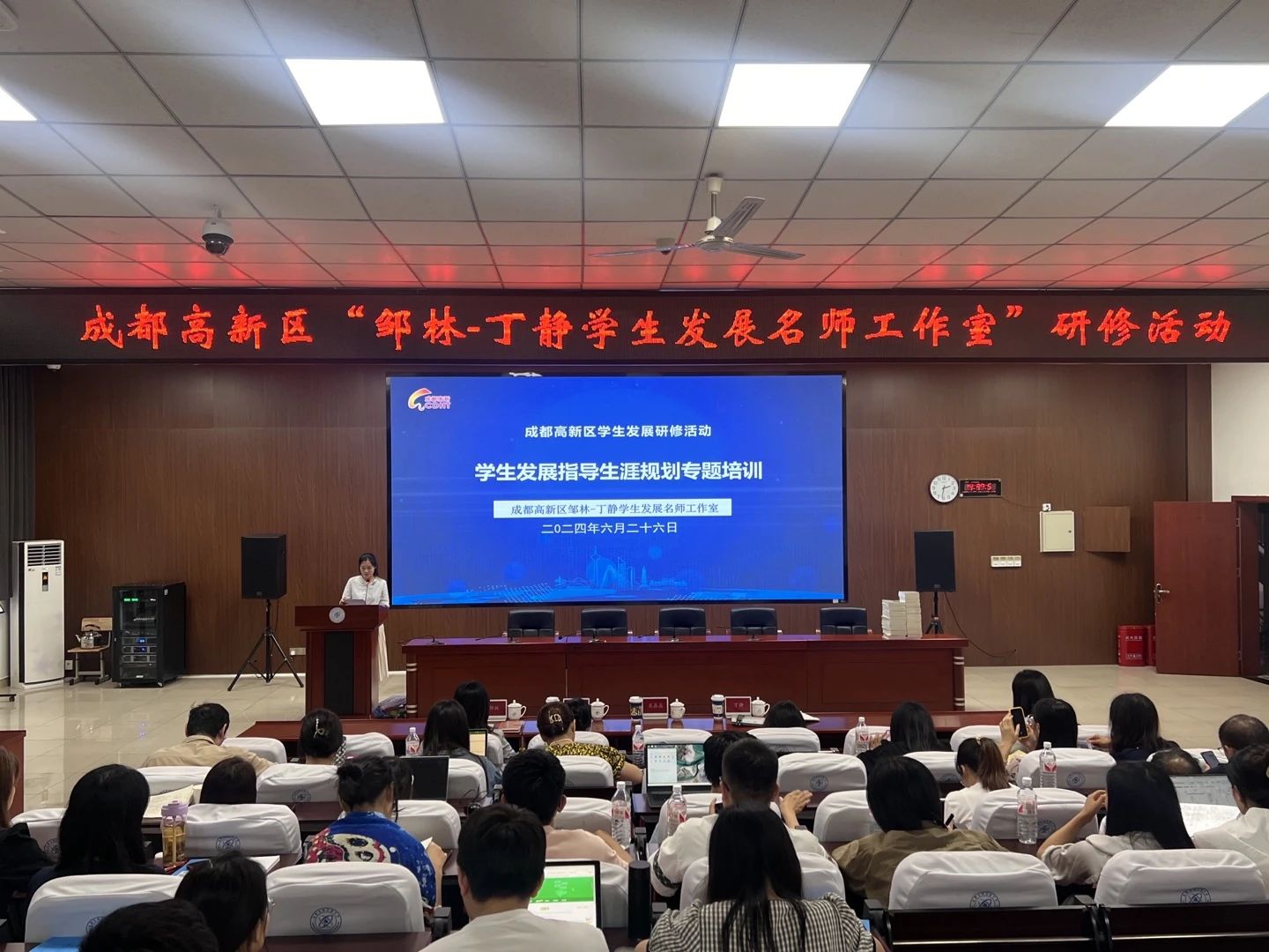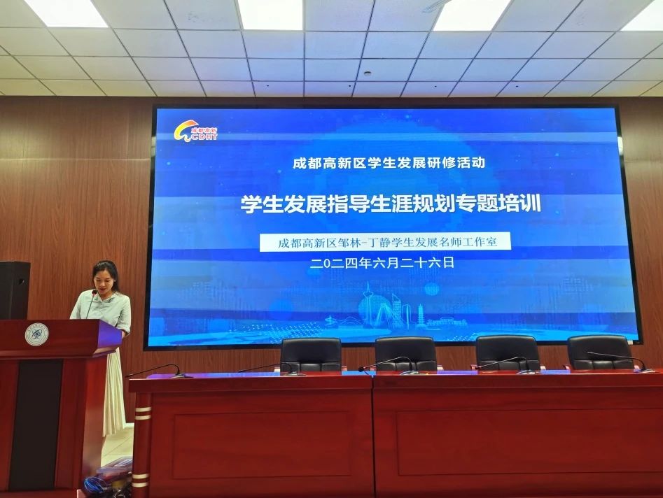 2024年6月26日下午,成都高新区学生发展指导生涯规划专题培训活动在成都高新实验中学举行。全区高一高二骨干班主任、新班主任、邹林·丁静名班主任工作室工作室成员学员、成都高新实验中学培优班主任工作坊成员参加了培训。活动邀请智联招聘西部大区总经理吴晶晶,成都市家校教育协会副会长、生涯教育专委会副主任陈筱芝莅临指导并作专题讲座,旨在提升区域班主任在新高考背景下的生涯教育能力。