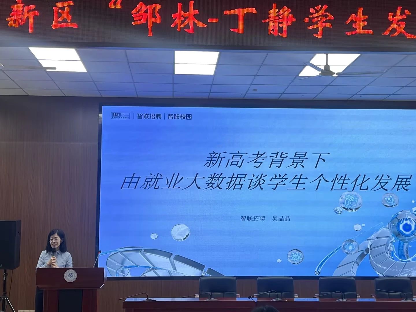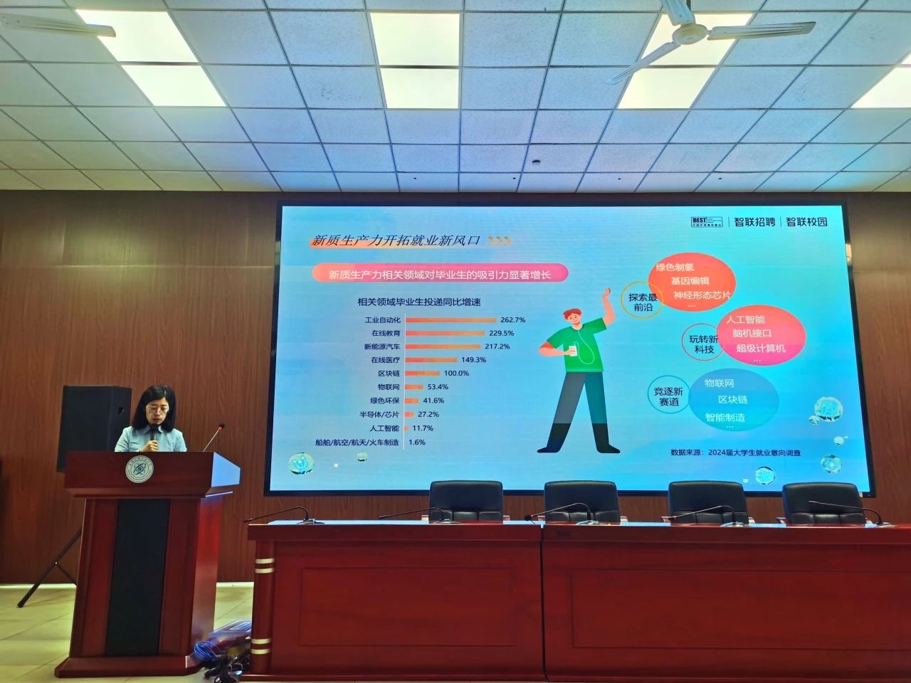 智联招聘西部大区总经理吴晶晶老师作《新高考背景下从就业大数据看学生个性化发展》专题讲座。首先,吴老师对2024届毕业生的校招趋势做了详细解读,指出最新毕业生的就业局面充满着机遇与挑战,就业路径呈多元化发展态势。之后,吴老师结合主要行业的最新招聘趋势,指出在当今经济形势下不同行业的人才需求变化较大,就业竞争激烈。