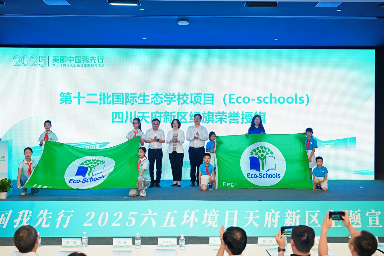 作为天府新区生态教育的重要实践地,天府七小、永兴小学于2025年成功上榜“第十二批国际生态学校项目(Eco-schools)绿旗荣誉”名单,活动现场为两所“绿旗”学校授旗,鼓励更多学校持续推进校园低碳实践。