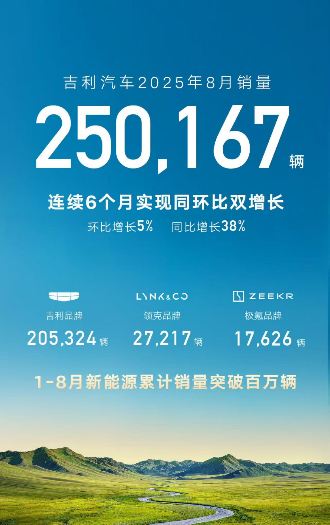 吉利汽车8月销量超25万辆,连续6个月同环比双增,新能源单月销量、渗透率均创历史新高!