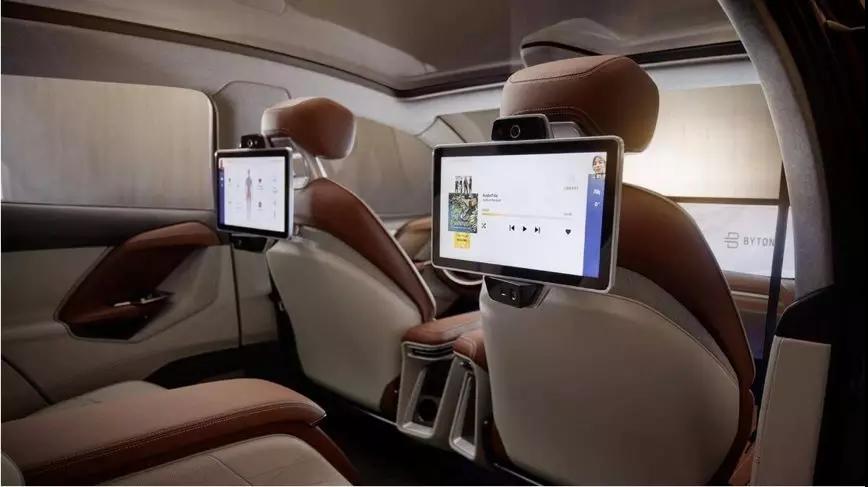BYTON Concept的屏幕可不止这些,后排同样装备了两个尺寸颇大的显示屏,在后排,你可以如使用平板电脑一样,完成大部分娱乐系统操作。
