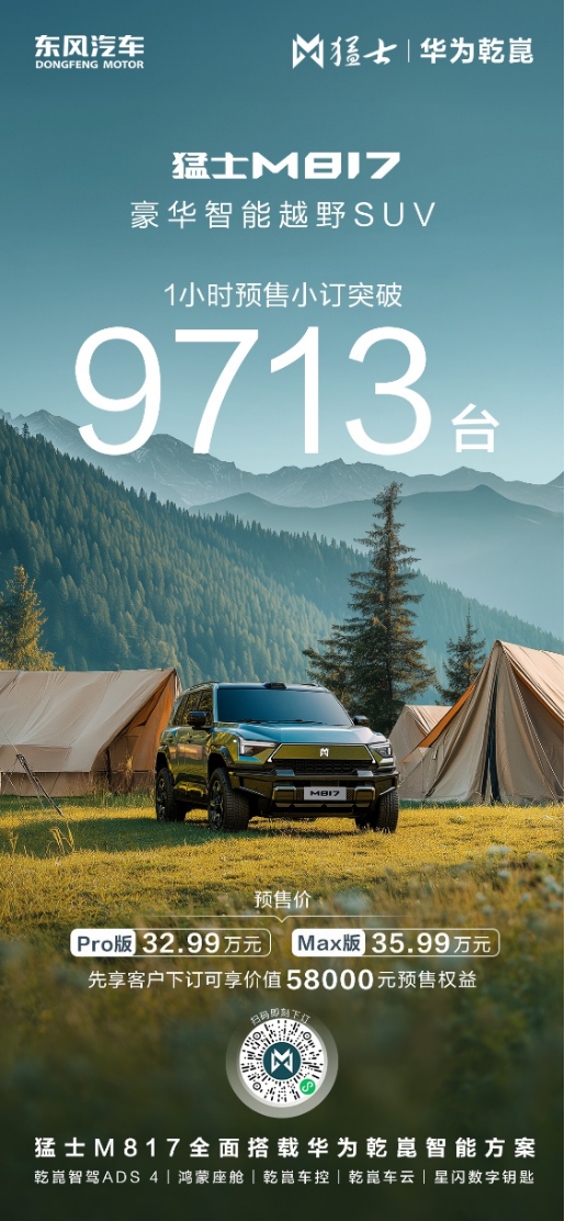 东风猛士科技与华为自签约以来,合作迅速开花结果。2025年4月22日,双方联合推出的“豪华智能越野SUV”猛士M817迎来全球首秀;7月17日,猛士M817开启预售,取得1小时9713台的预售战绩;8月17日,猛士M817上市以来,销量持续火爆,同时口碑还获得同级车第一,实现销量口碑双丰收。