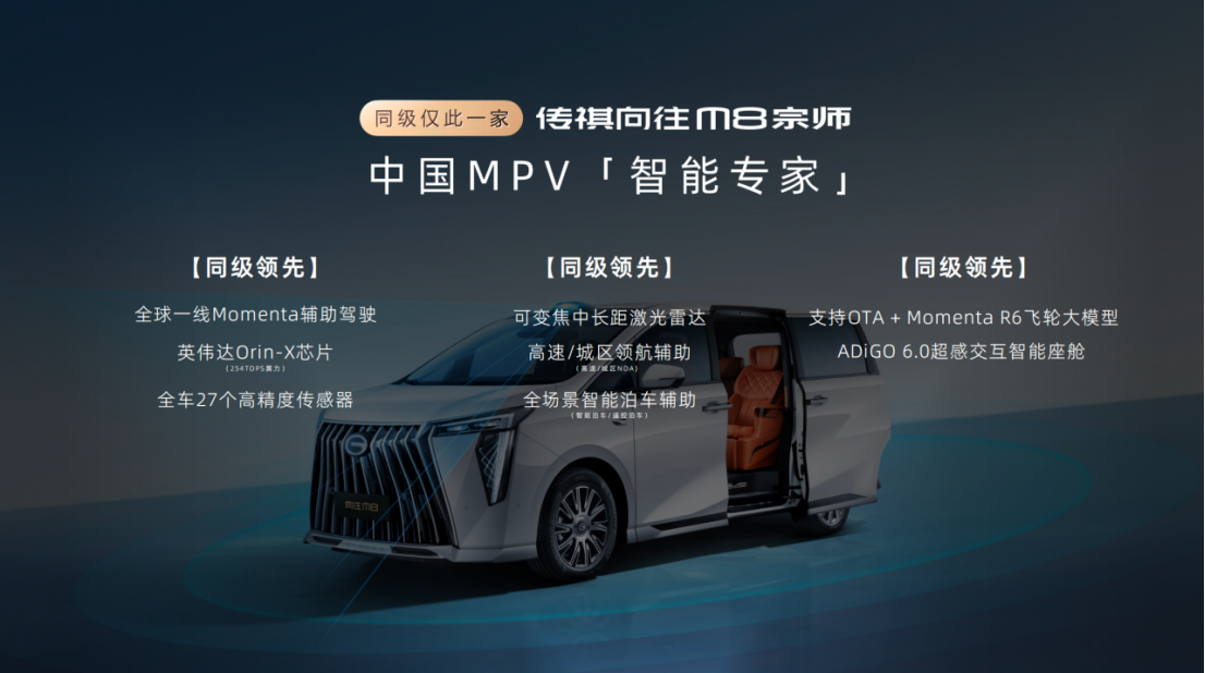 向往M8宗师的追求不止于物理层面的乘坐享受,更在于为用户构建一个更智能、更从容的出行体验。纵观25-30万级MPV市场,基本都没配备第一梯队的辅助驾驶功能,用户想要也没得选。为此,向往M8宗师搭载全球一线Momenta辅助驾驶,将这份“老司机”般的从容,赋予每一位用户。