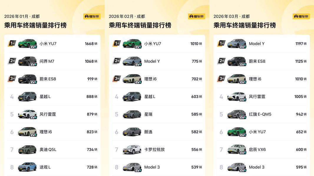 一季度成都市场最大的现象级车型是小米YU7。1月和2月,它连续位居国内主流车型销量第一:1月1668辆,2月1010辆,把Model Y、问界M7、蔚来ES8甩在身后。当时网上争议不少,但成都用户用订单做出了选择。原因有三:小米在西南的用户基础强,手机生态用户自然转化;产品设计、性能、智驾切中年轻家庭需求;争议即流量,越讨论关注度越高。到了3月,YU7排名回落到第六位(652辆)。这很正常:前期订单交付完毕,市场回归理性,竞品分流——不是产品不行,而是从爆款变成常销款。但可以肯定,小米YU7已在成都站稳20-30万元级别的高端新能源市场。