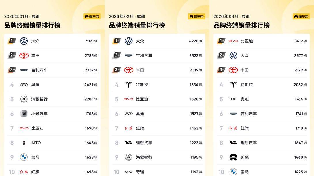 从一季度成都市场的品牌终端销量看,大众1月5121辆、2月4220辆,3月被比亚迪反超,以3577辆降至第二。丰田稳定在前三,但销量从1月的2785辆降至3月的2129辆。更值得关注的变化是:3月份,比亚迪以3612辆登顶品牌第一。吉利汽车3月1741辆排名第六,理想、蔚来、小米等也挤进前十。这说明,大众、丰田的体量依然不小,但增长乏力,主要靠燃油车和混动支撑。而以比亚迪、吉利、理想为代表的国内主流品牌,正在快速蚕食市场份额。