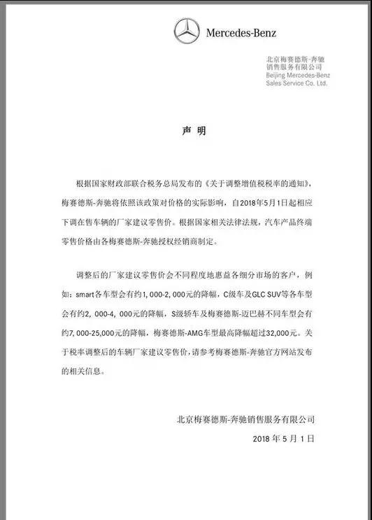 奔驰宣布5月1日起下调建议零售价,最高降幅超过32000元;