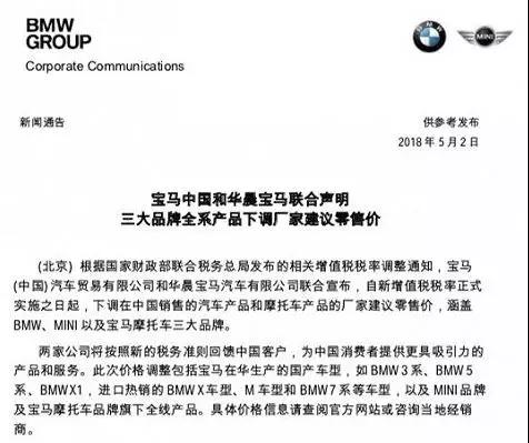 此外,宝马中国和华晨宝马在5月2日联合发表声明,宣布将下调在中国销售的汽车产品和摩托车产品的厂家建议零售价,最高降幅也达到了32000元;