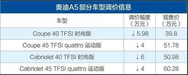 终于,5月3日,奥迪也按捺不住,加入了这一波官降之路,但似乎与之前几位小伙伴的方式不同,奥迪仅对A5、S5两款车做了价格调整,不过,降价幅度是最大的,达到了4-6万元。